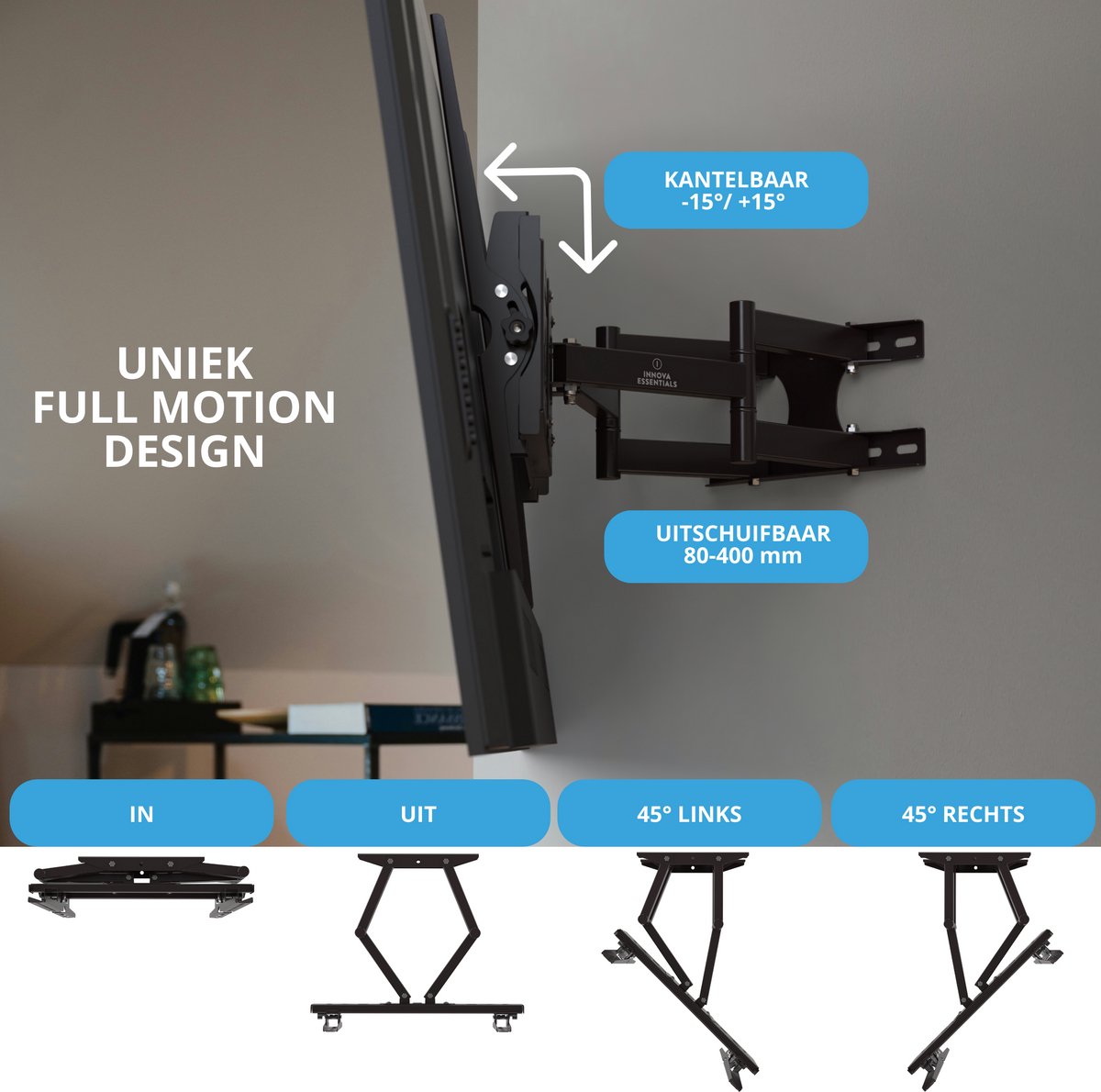 Volledige bewegingsvrijheid: kantelbaar, draaibaar en uitschuifbaar (80–400 mm) | Draaibereik 45° kan beperkt zijn in zeer brede kamers met meerdere zitniveaus |