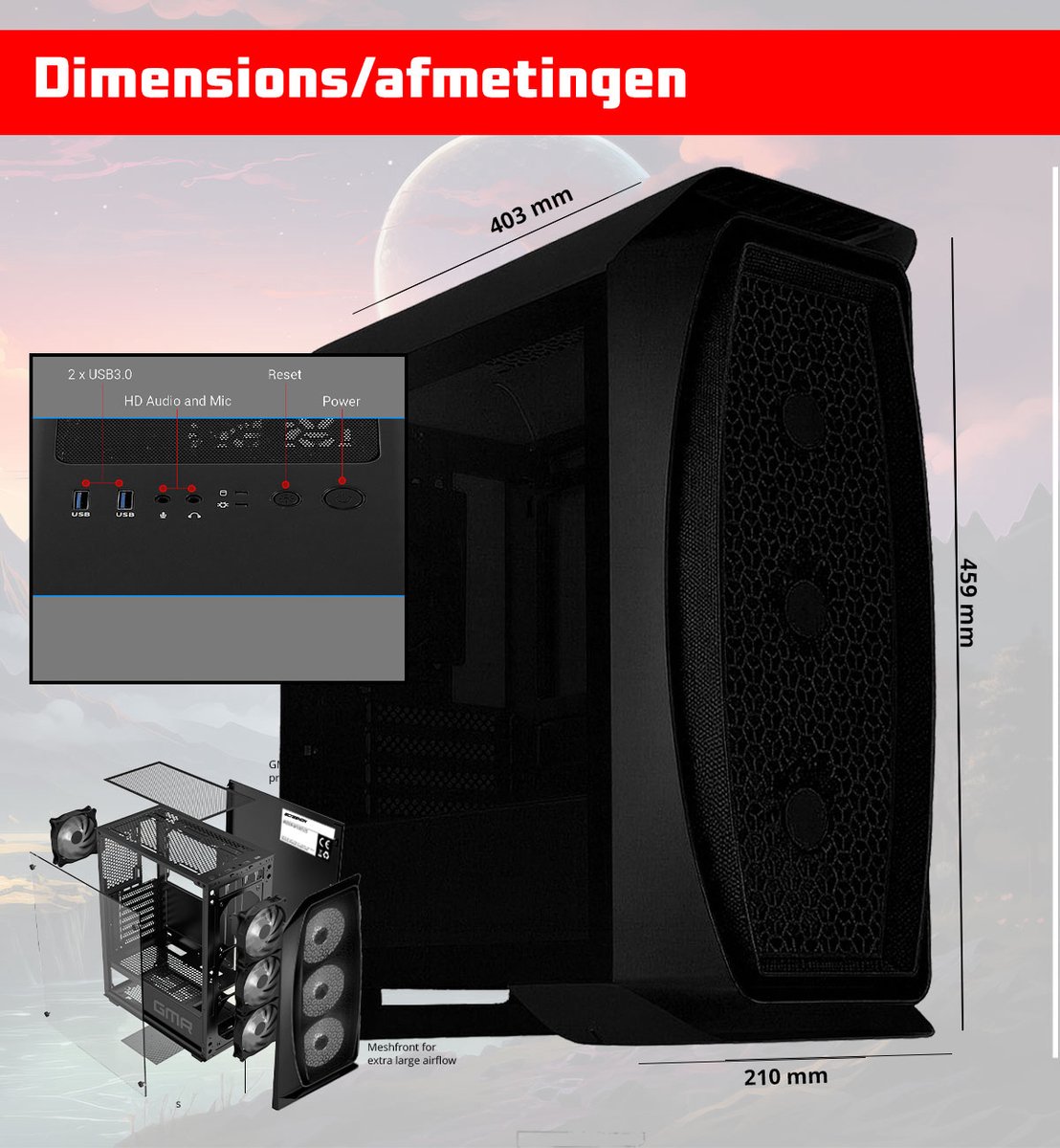 - Afmetingen en gewicht: Niet vermeld. Reken in de praktijk op een middelgroot torenmodel, maar hou rekening met de beschikbare ruimte onder of naast je bureau.