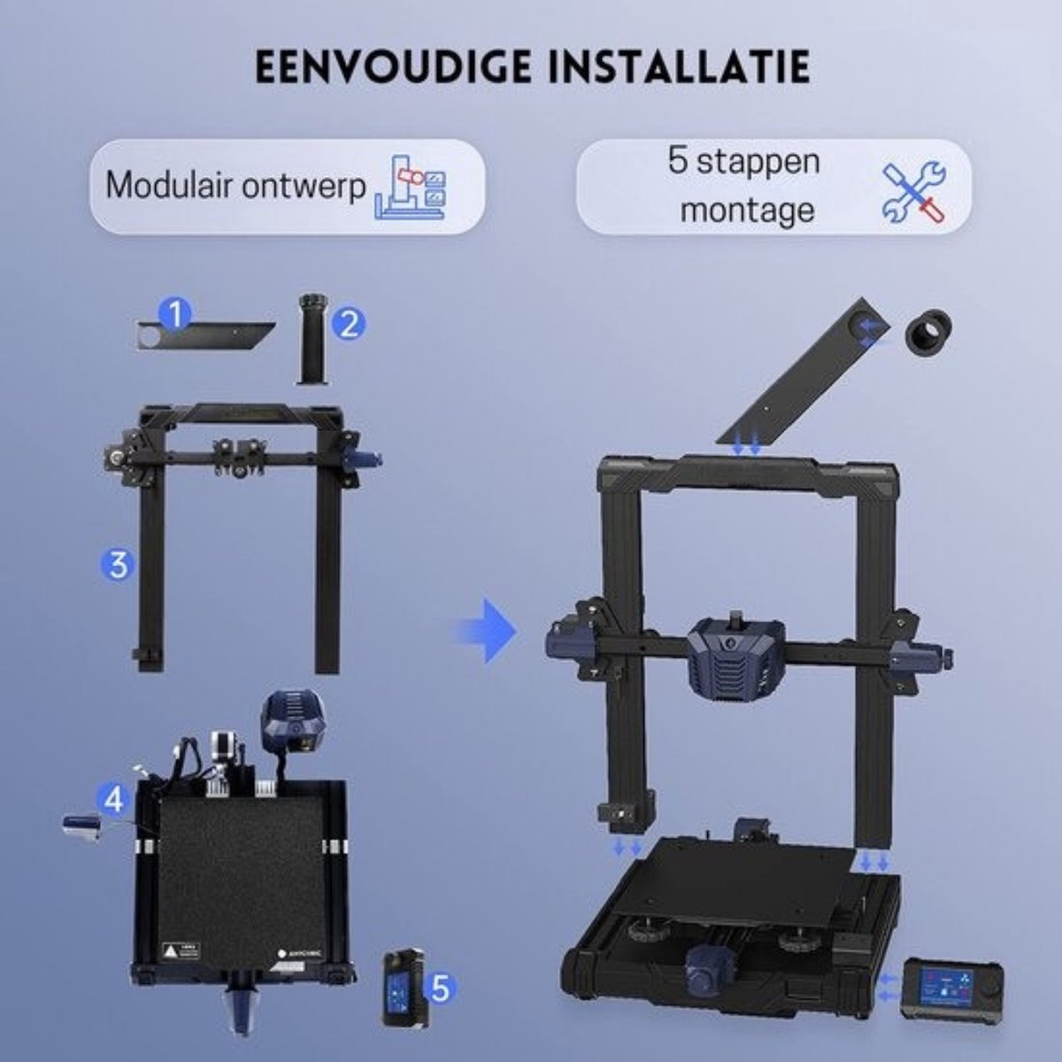 Volgens de productvermelding kun je de printer binnen enkele minuten opbouwen dankzij het modulaire ontwerp, met tot 80% tijdsbesparing in de installatie (bron: productvermelding, gecontroleerd 2025). Dat is ideaal voor scholen, werkplaatsen en thuisgebruikers die de leercurve kort willen houden. Minder losse stappen betekent ook minder kans op scheef gemonteerde onderdelen en een snellere kalibratie.