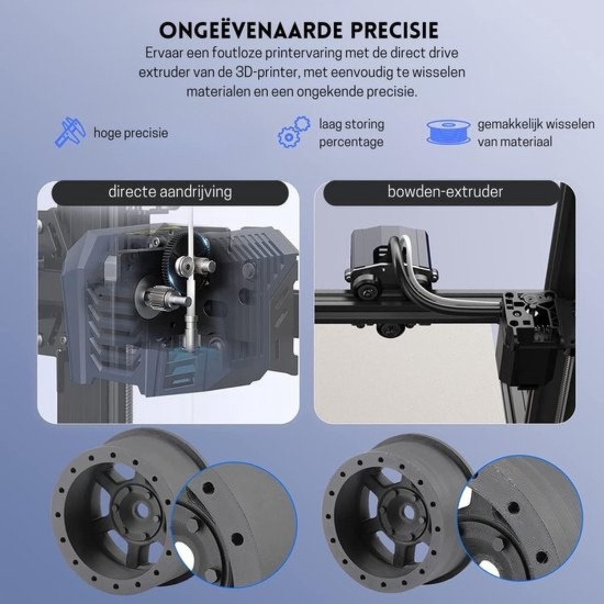 - Druk nauwkeuriger met minder trilling, direct aangedreven extruder.