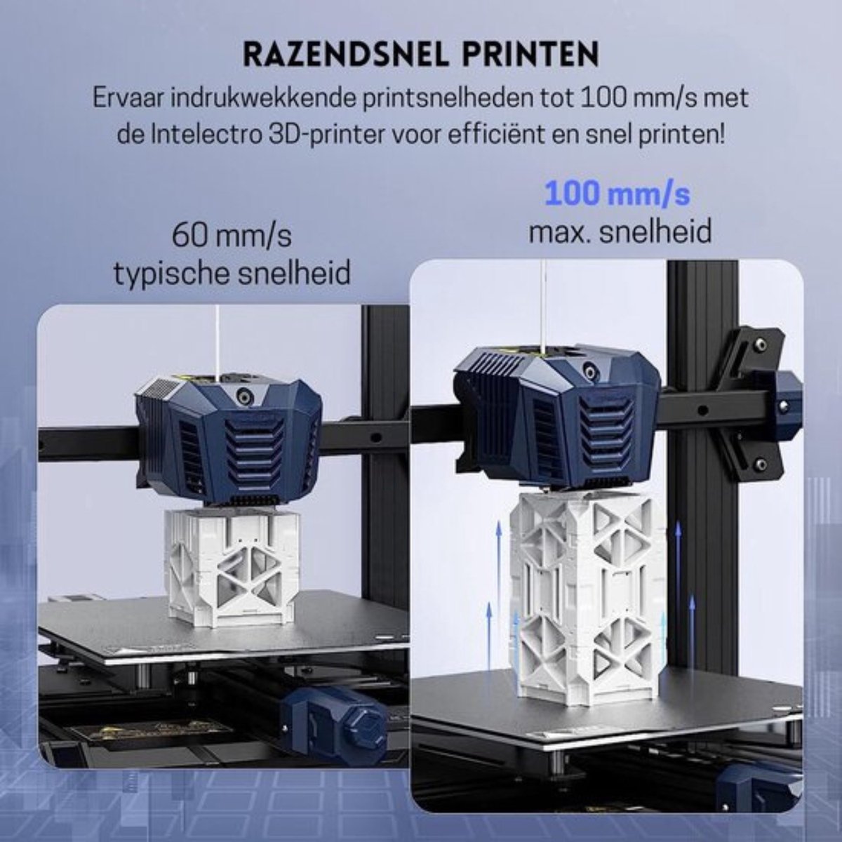 De Intelectro 3D-printer richt zich duidelijk op betrouwbare resultaten met zo min mogelijk rompslomp. De 25-punts automatische bednivellering, het dubbelzijdige PEI-bed en de directe aandrijving lossen precies die punten op waar beginners en gevorderden doorgaans tijd verliezen. In combinatie met de modulaire montage en de aanpasbaarheid via Marlin is dit een printer die je snel onder de knie hebt en die vervolgens met je meegroeit.