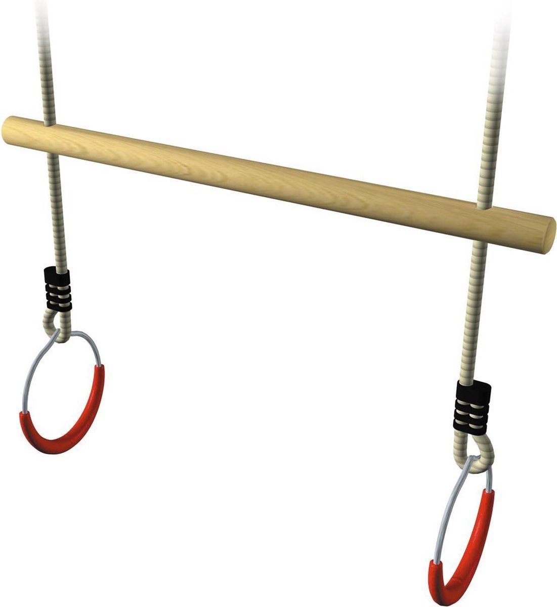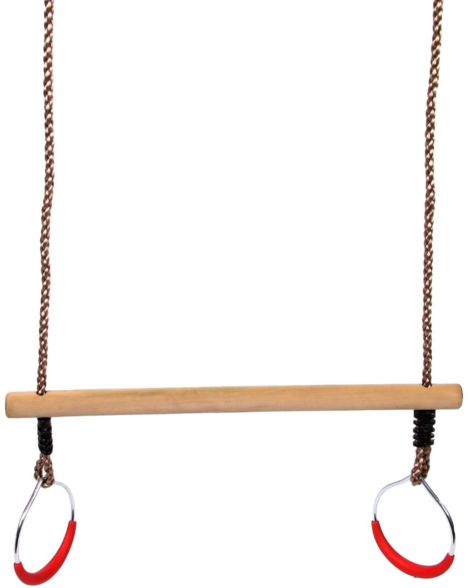 Ergonomie: de combinatie van een 35 mm stang en 14,5 cm ringen maakt deze set geschikt voor kinderen en jongvolwassenen. De ophanghaken vergemakkelijken wisseling van accessoires zoals schommelhaken, mits de haken correct en stevig zijn bevestigd.