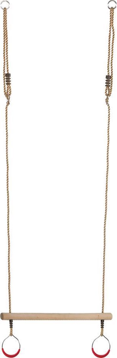 Dit rekstok speeltoestel is een compacte set voor binnenshuis of in de tuin die bestaat uit een rekstok (35 mm), een ringenset van 14,5 cm, 12 mm sisaltouw en ophanghaken voor schommelhaken. De nokhoogte volgens de lijst is 2,25 m, wat van belang is voor montage en gebruik. (bron: listing, gecontroleerd 2025)