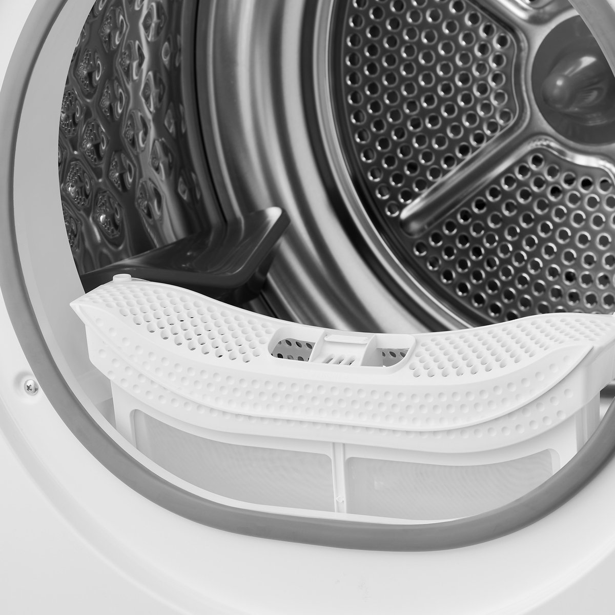 De ingebouwde ledverlichting zorgt dat je altijd zicht hebt in de trommel. Handig als de droger in een minder verlichte ruimte staat of als er kleine items — sokjes, ondergoed — tussen grotere stukken terechtkomen. Het bespaart tijd en voorkomt achterblijvers.