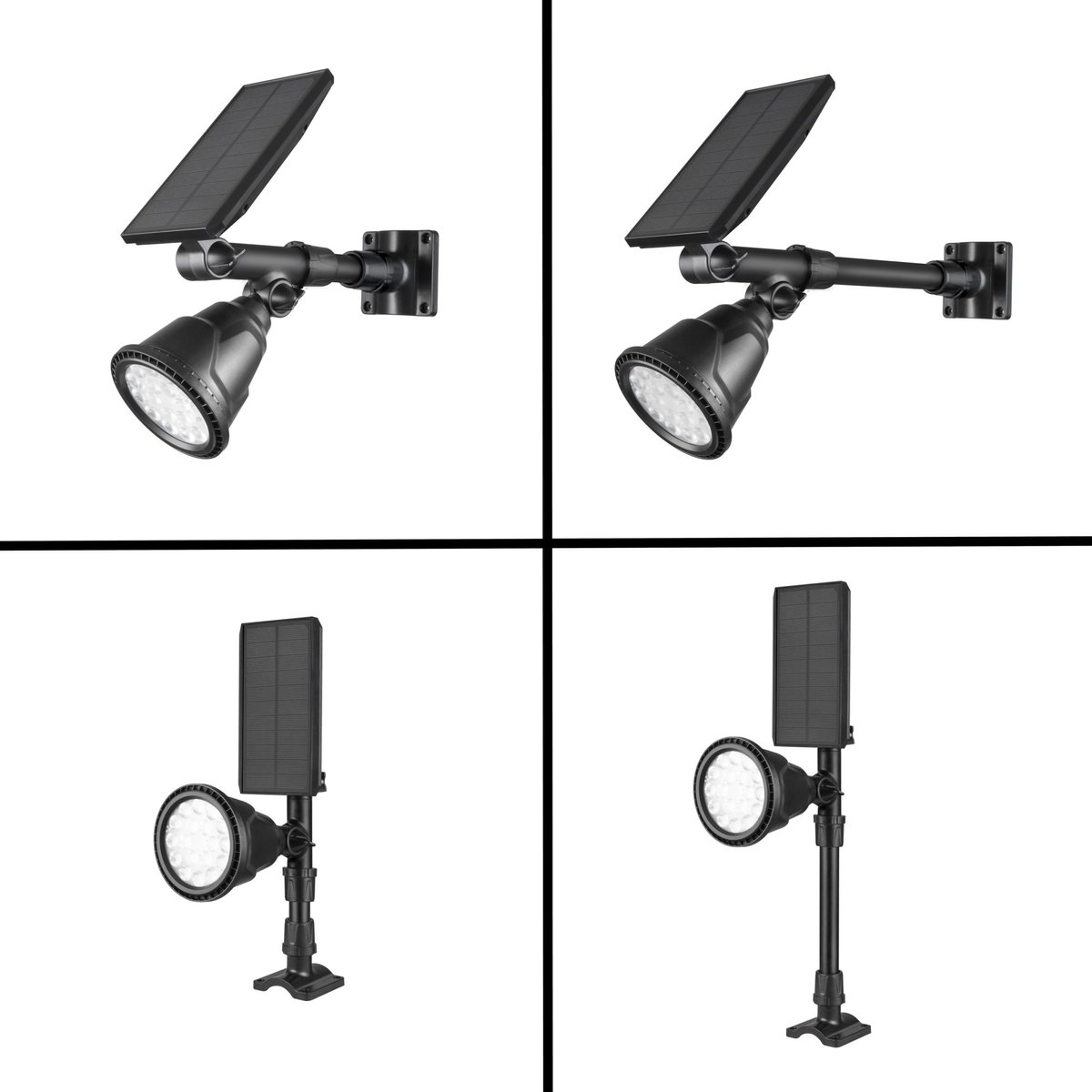 - Wandmontage: gericht licht vanaf een schutting of gevel, met vier bevestigingspunten voor een stevige verankering.