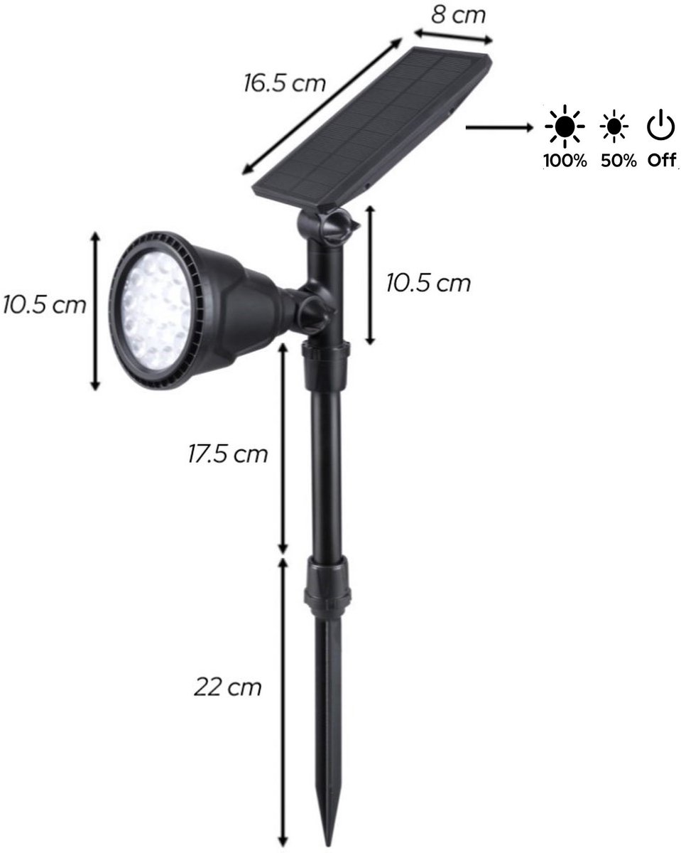 De afmetingen zijn praktisch en goed gedocumenteerd. Het zonnepaneel meet 16,5 x 8,0 x 3,0 cm, de armatuurkop 10,5 x 10,5 x 11 cm. De lengte varieert afhankelijk van de configuratie: