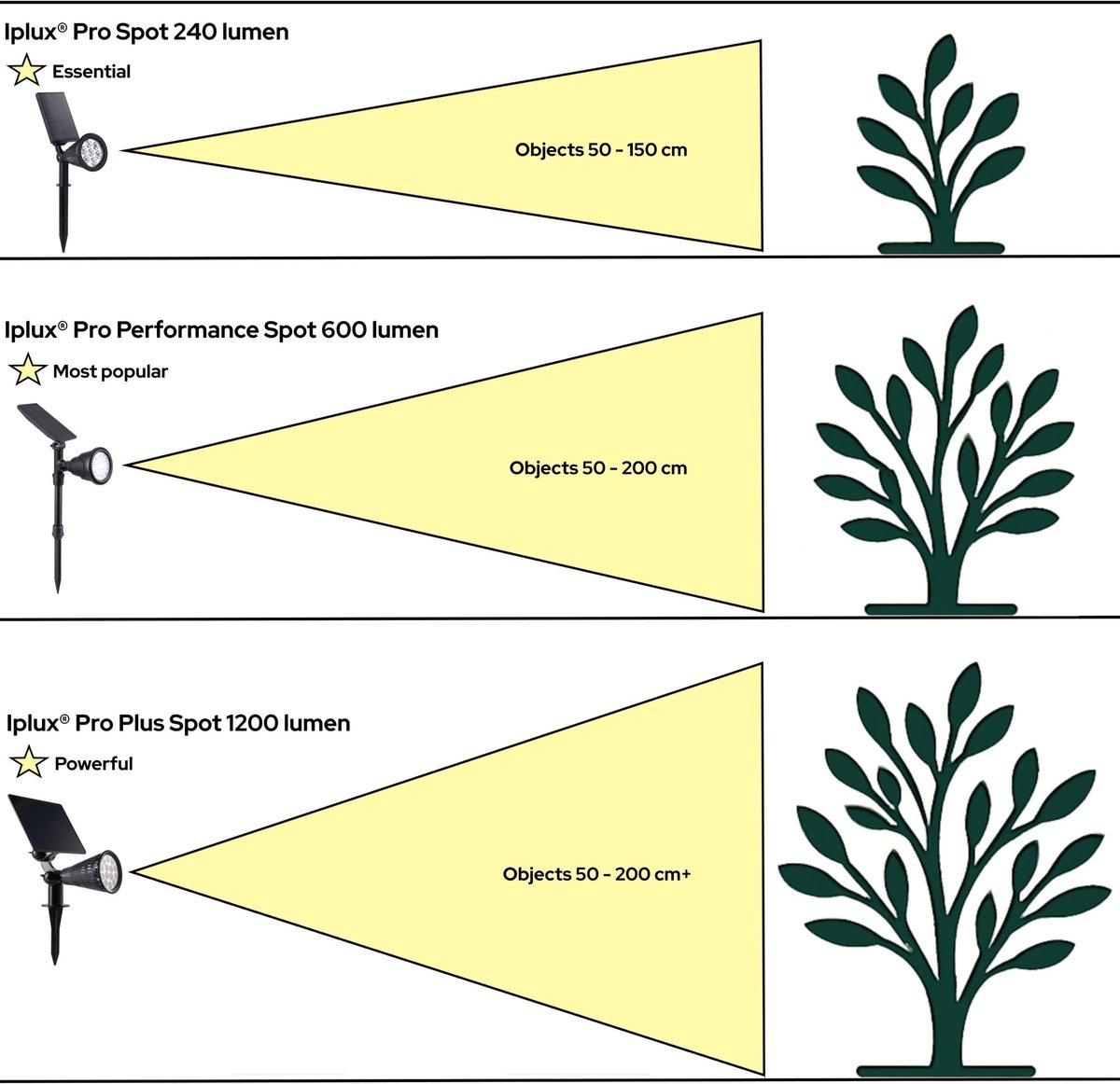 Wat een enorme lichtopbrengst! Ideaal om hoge bomen en dergelijke uit te lichten. Het zonnepaneel is vrij groot, maar daardoor brandt de spot heel lang, zelfs op de hoogste stand. Ik heb inmiddels meerdere Iplux-spots; niet goedkoop, maar de kwaliteit is het waard. Zeker een aanrader!