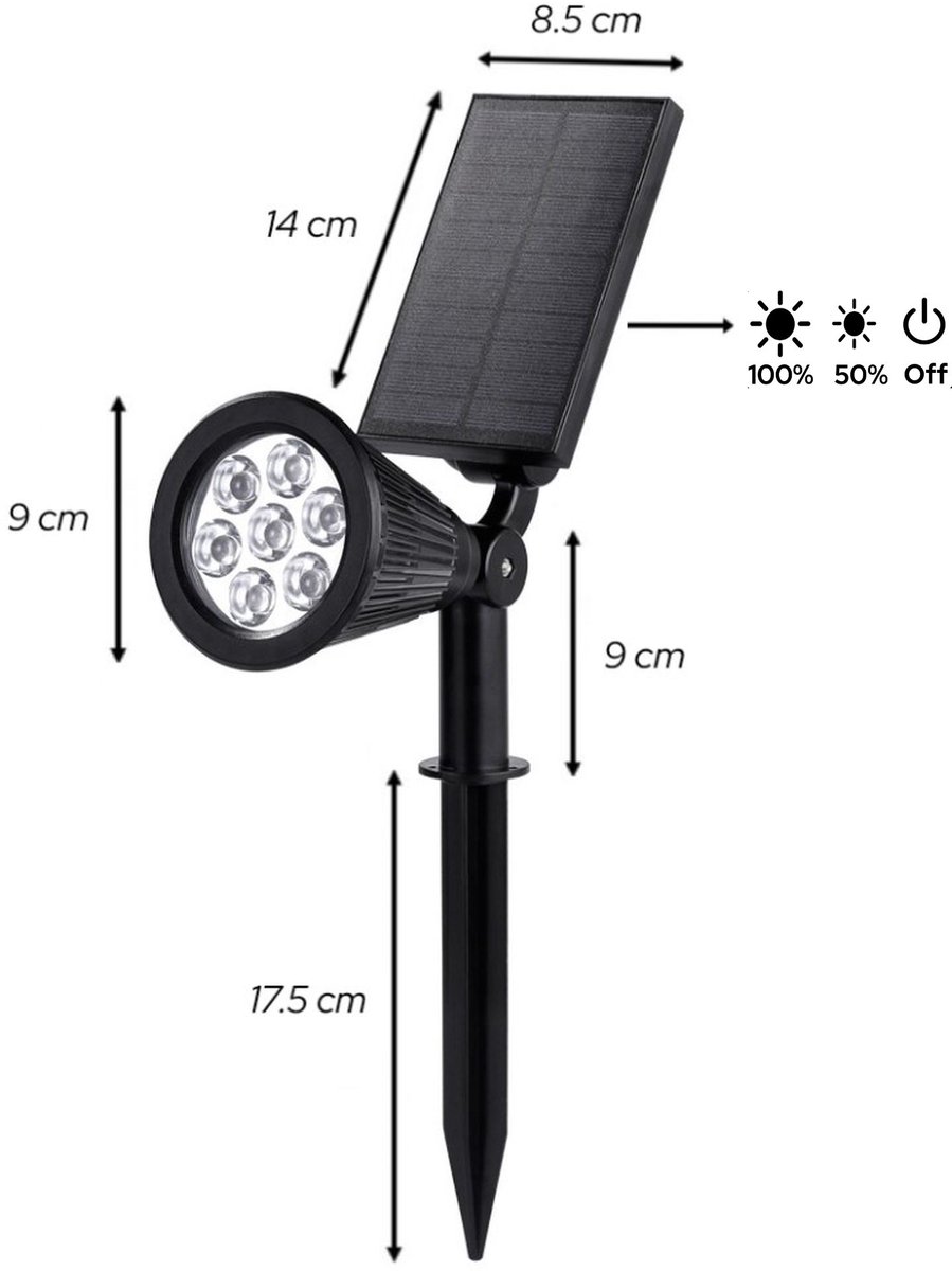 Belangrijke afmetingen die de plaatsing vergemakkelijken zijn duidelijk opgegeven. Het polykristallijne silicium zonnepaneel meet 14 x 8,5 x 2,4 cm (l x b x h). De kop van de armatuur is 9 x 9 x 12 cm, de armatuurvoet (zonder grondspies) is 9 cm lang, en de grondspies zelf is 17,5 cm. In de praktijk geeft dat genoeg marge om de spot stabiel in aarde of grind te steken, of om hem tegen een muur te bevestigen met de meegeleverde materialen.