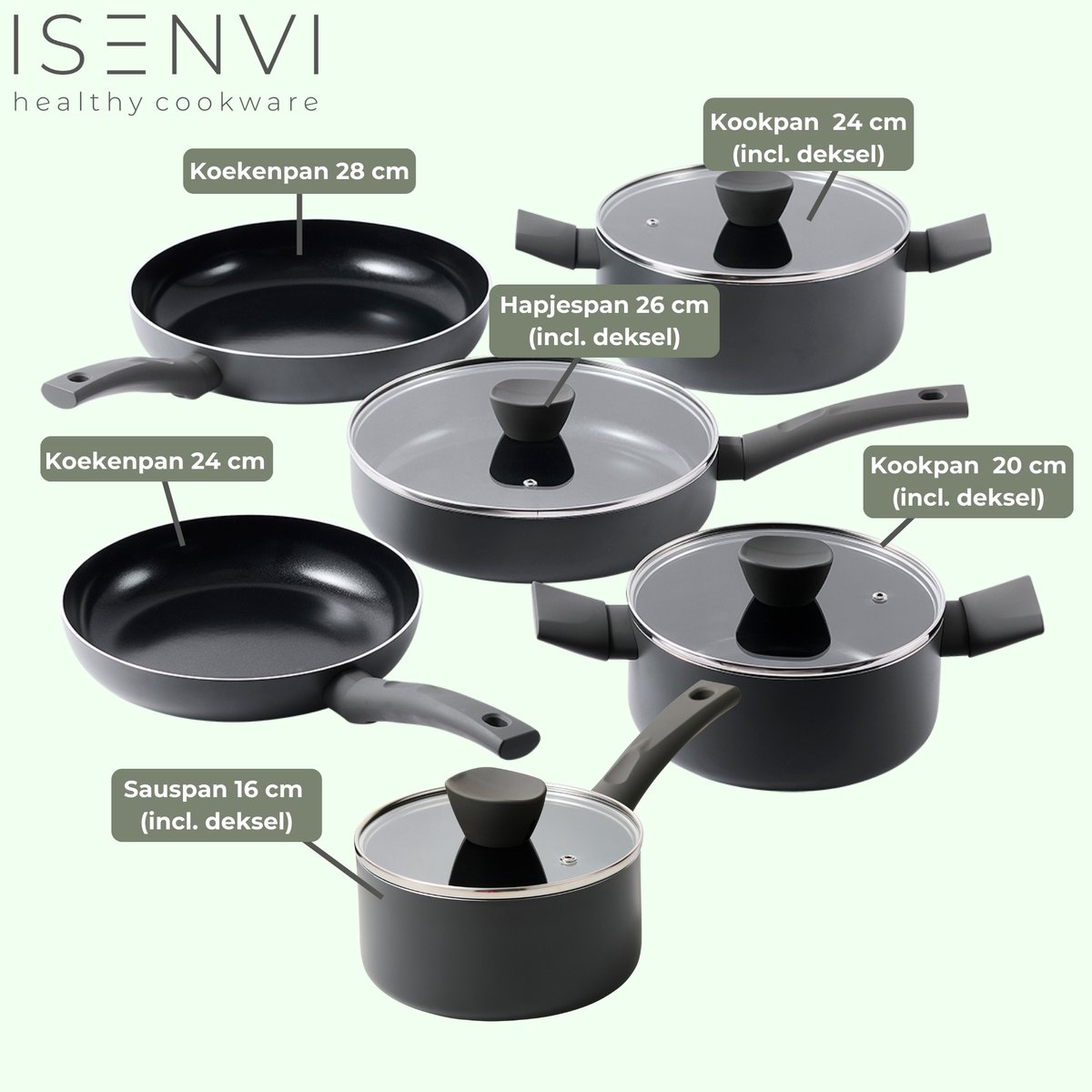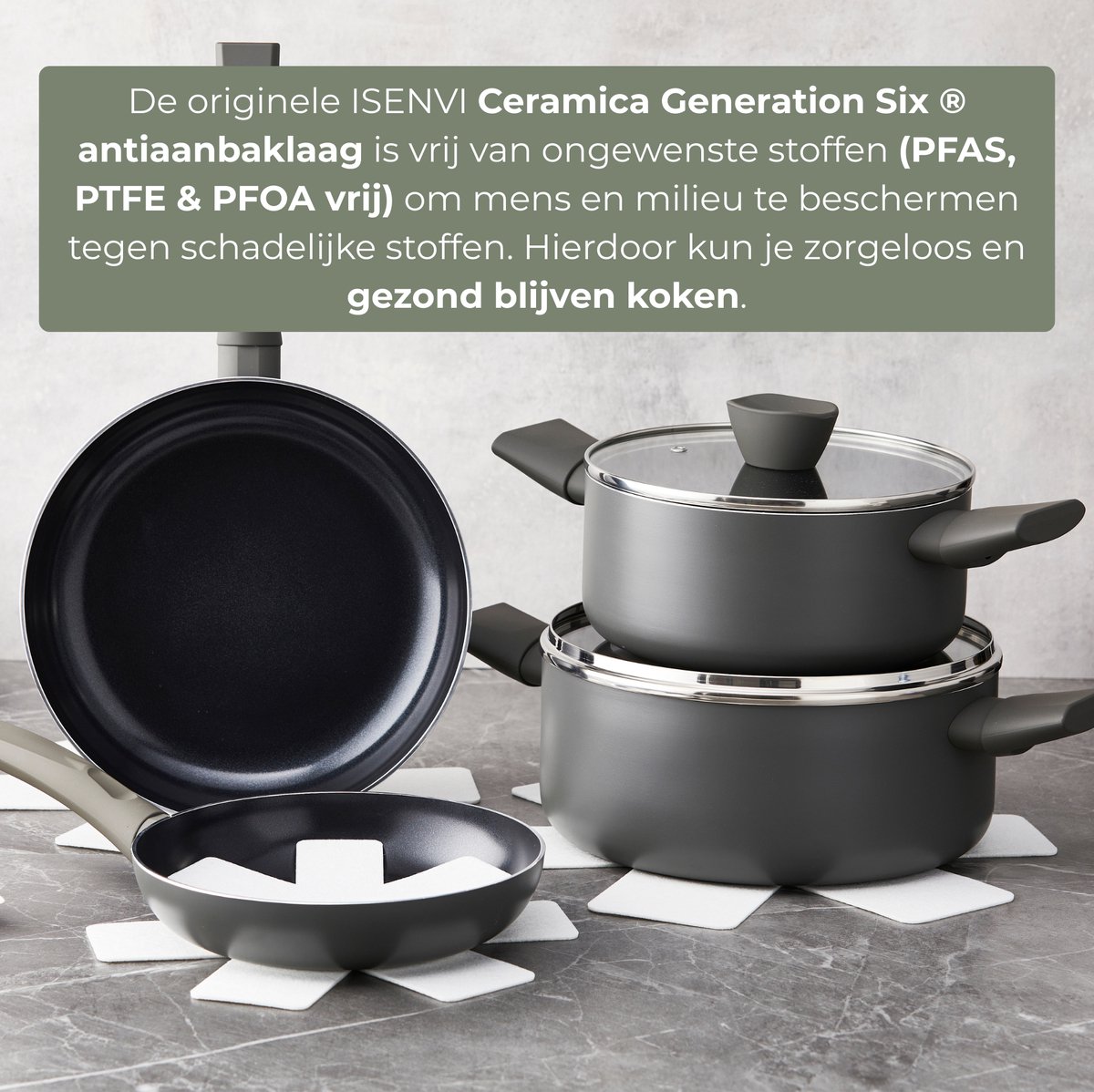 Overzicht:De ISENVI keramische pannenset Chef Maison is een 15-delige pannenset, perfect voor Nederlandse keukens en wie overstapt op inductie. De set bevat onder meer koekenpannen van 24 en 28 cm en is volledig PFAS-vrij.