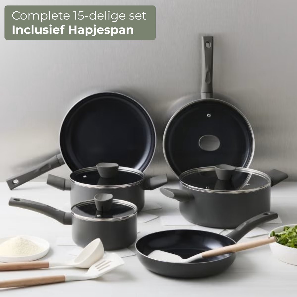 Compleet 15-delig pakket met gereedschap en pannenbeschermers Levensduur van keramische coating kan variëren bij intensief gebruik