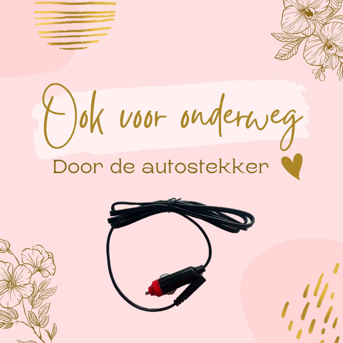 De meegeleverde Europese stekker gebruik je thuis, de autolader in de auto. Handig voor weekendjes weg, een lange rit of een bruiloft op locatie. Let op: