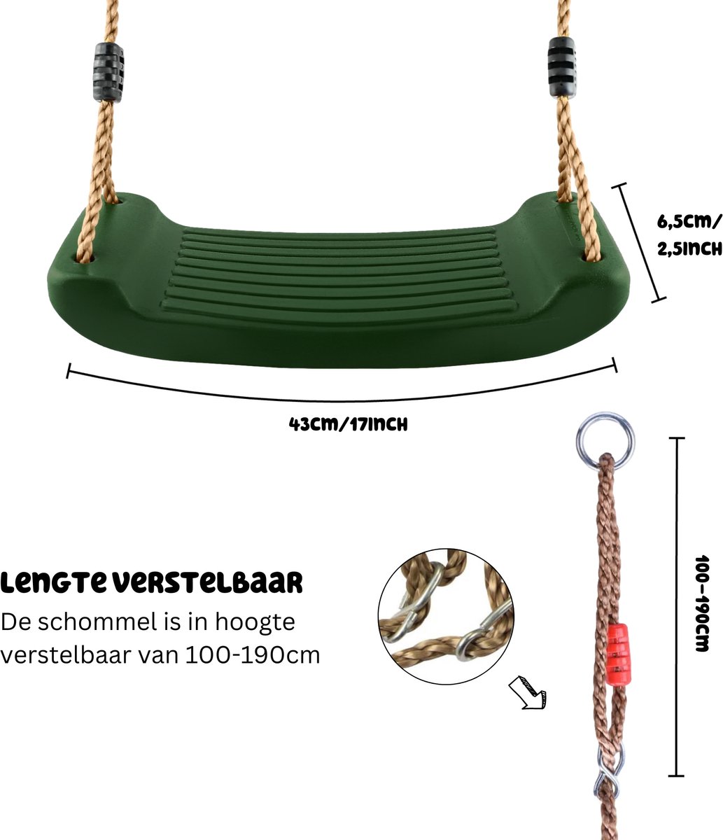 Overzicht:Deze kinderschommel van JAXY biedt veilige, duurzame schommelpret voor Nederlandse gezinnen. De ergonomische zitting heeft een antislip 3D-oppervlak en is verstelbaar tot 1,80 m.