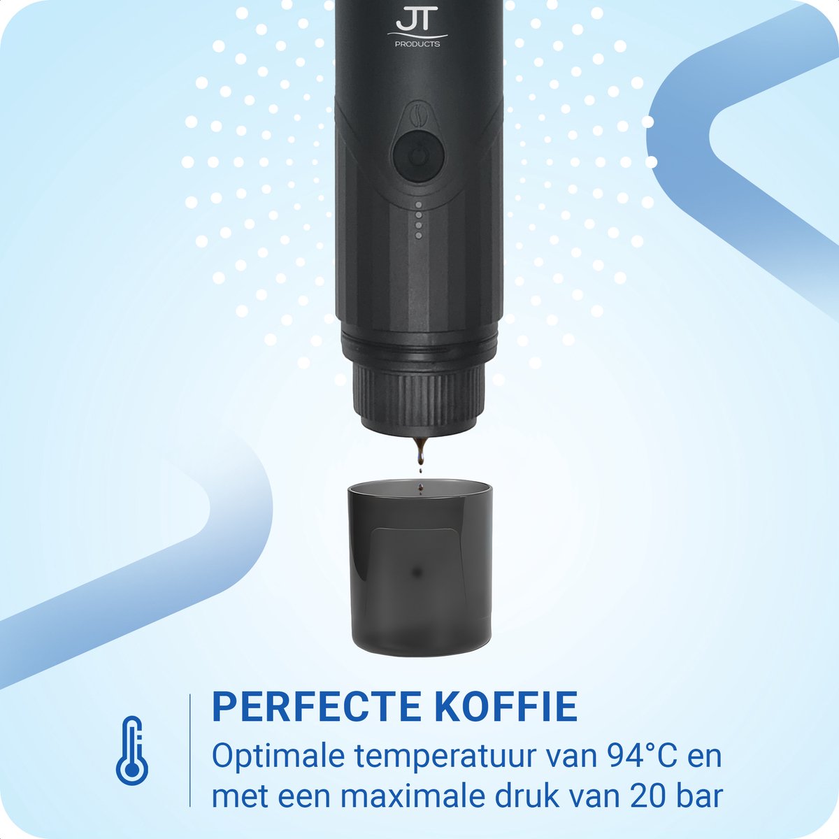 Overzicht:De JT Products Draagbare Elektrische 2-In-1 Espressomachine is een draagbare espressomachine voor Nederlandse koffieliefhebbers die vaak onderweg zijn. Zet zowel capsules als gemalen koffie en profiteer van een 7500 mAh accu voor meerdere kopjes onderweg.