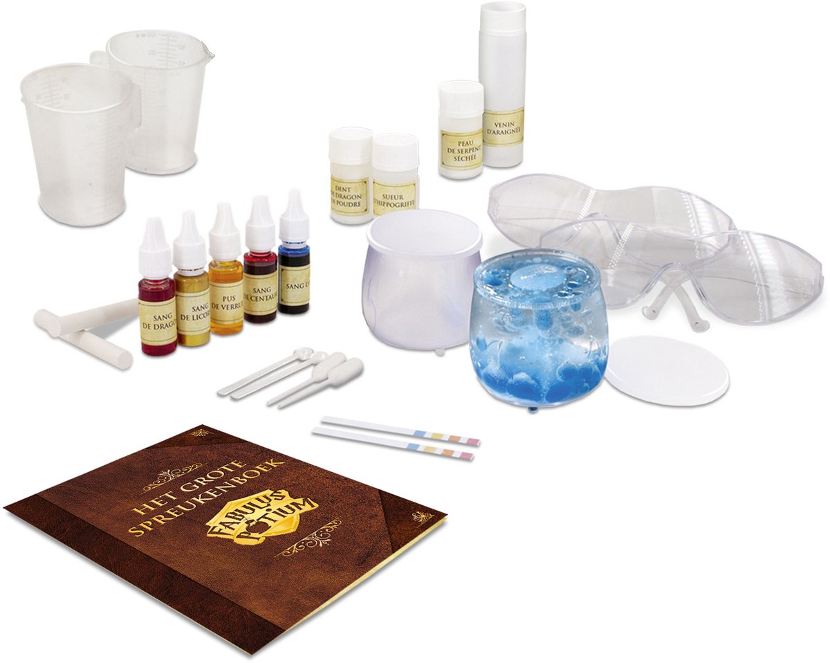 | Accessoires | 2 ketels met deksel, 2 veiligheidsbrillen, 2 pipetten, 2 bekers, 2 maatlepels, etiketten, Spreukenboek, spelregels |