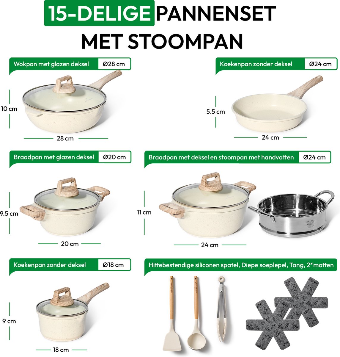 Complete 15-delige set met pannen, deksels, stoominzet en keukengerei — direct klaar voor gebruik | Handwas aanbevolen voor langere levensduur; niet ideaal als je alle pannen in de vaatwasser wilt doen |