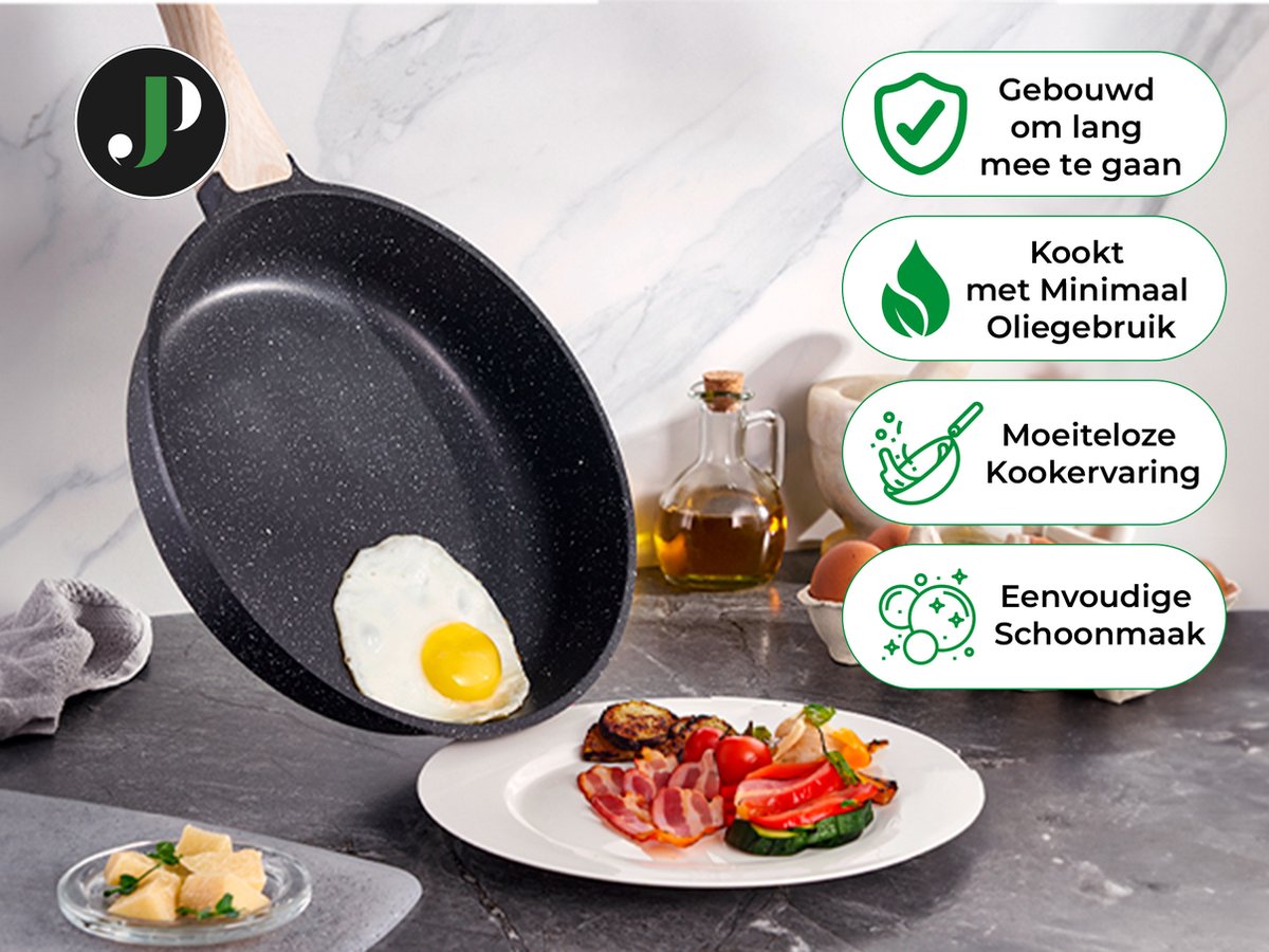 De binnenlaag gebruikt een Pfluon anti-aanbak marmeren coating die helpt voedsel los te laten en schoonmaken eenvoudiger maakt. Dit is vooral handig bij eieren, pannenkoeken en delicate visfilets. Omdat de coating krasbestendiger is dan sommige standaard anti-aanbaklagen, kun je met siliconen keukengerei veilig werken.