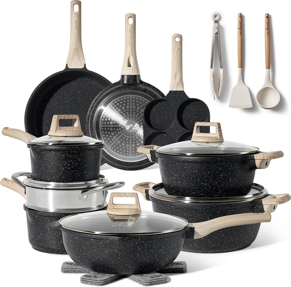 Esthetiek: de marmeren coating geeft een moderne, nette uitstraling die goed past in de meeste keukenstijlen zonder te schreeuwen. De toevoeging van felt pads en siliconen gereedschap zorgt voor een complete, verzorgde beleving bij opslag en koken.