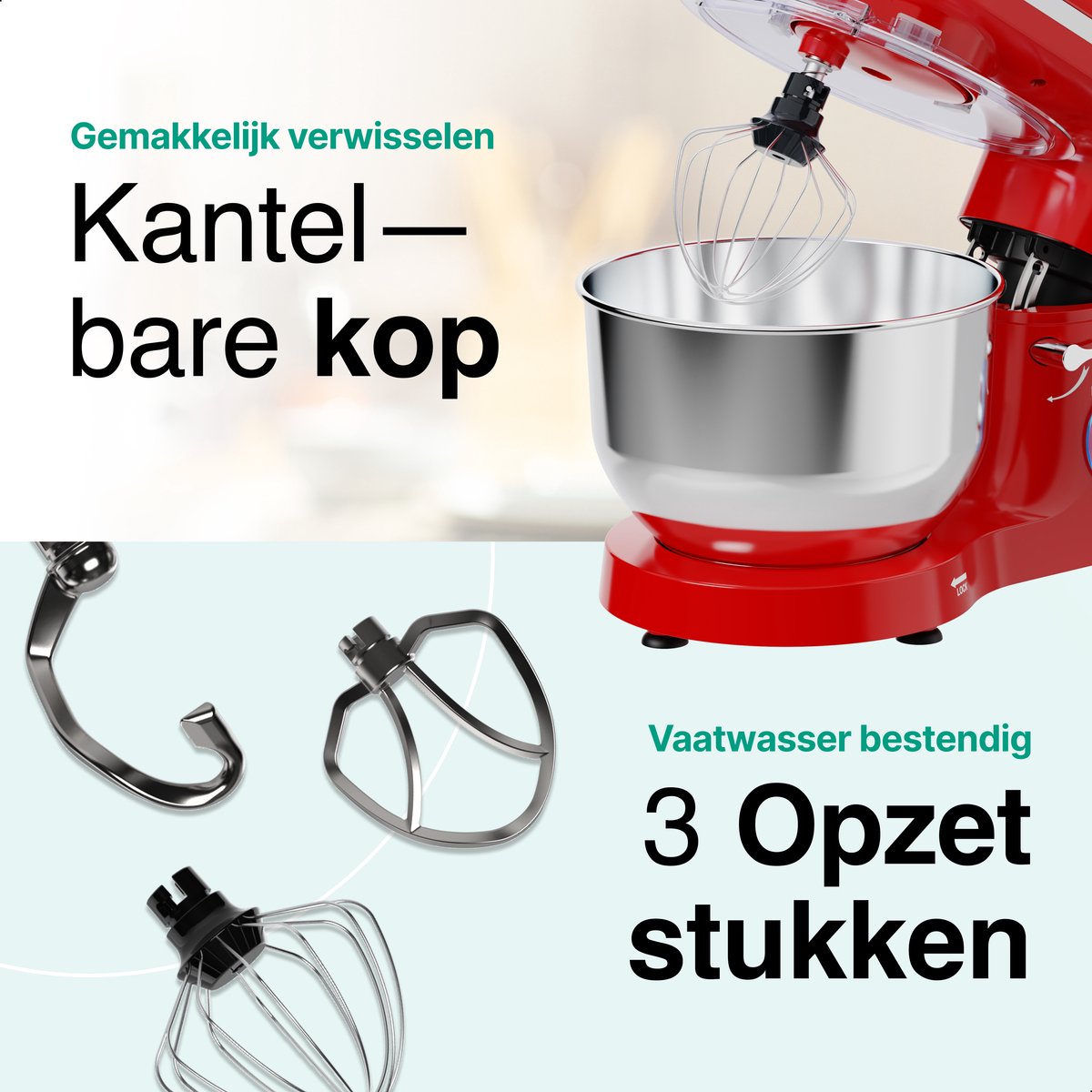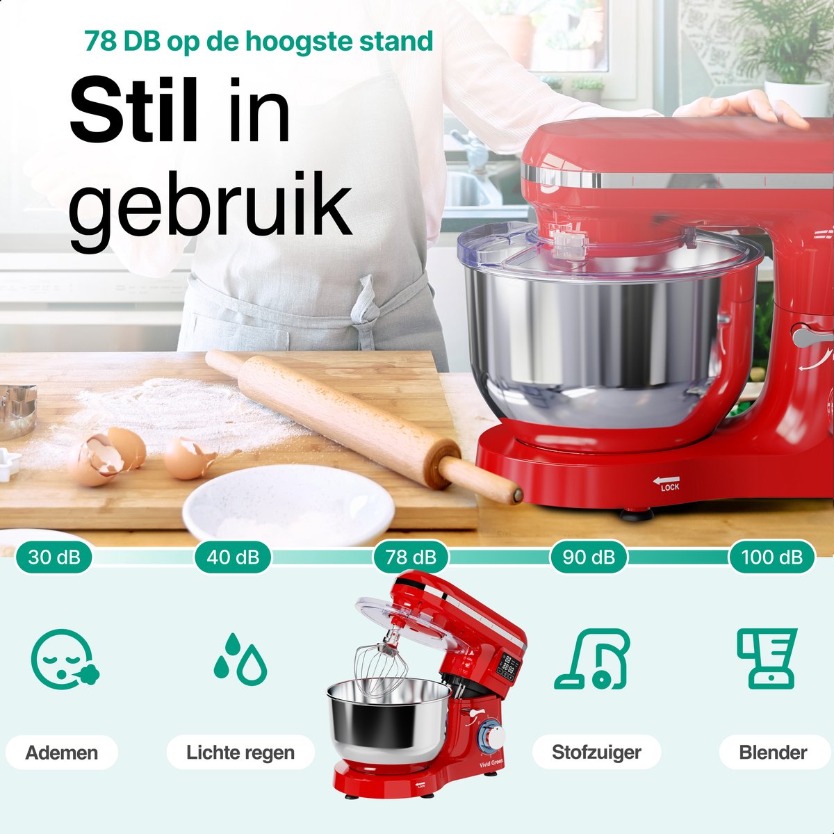De Vivid Green Keukenmachine heeft een solide, praktische opbouw met een kantelbare kop. De RVS mengkom van 6,2 liter is groot genoeg voor royale batches deeg of beslag en is vaatwasserbestendig. De machine is uitgevoerd in de kleur rood en staat stevig dankzij anti-slip zuignappen. De afmetingen zijn 387 x 238 x 314 mm en het gewicht is 4800 g (bron: listing, gecontroleerd 2025). Dit betekent in de praktijk twee dingen: hij neemt een serieuze plek op het aanrecht in, maar die massa helpt hem óók stabiel blijven bij zwaardere taken zoals brood- of pizzadeeg.