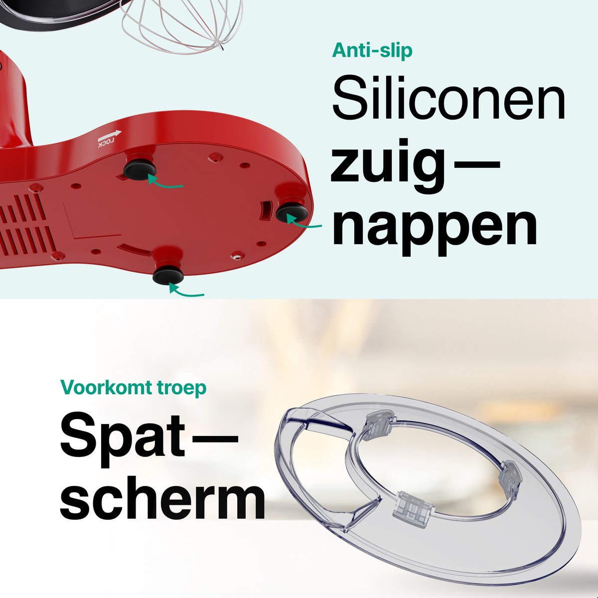 Het meegeleverde spatscherm helpt ingrediënten binnen de kom te houden bij hogere snelheden of wanneer je bloem en vloeistof toevoegt. Resultaat: minder schoonmaakwerk en minder verlies van ingrediënten. Zeker bij het ‘aanmaken’ van cakebeslag of het hydrateren van brooddeeg is dit prettig.