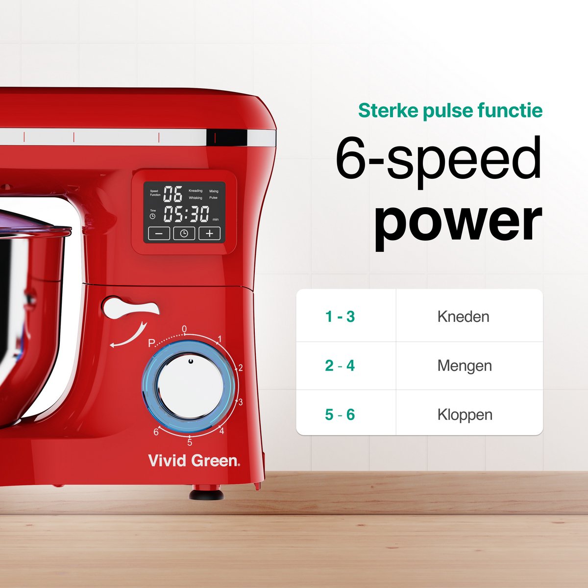 De Vivid Green Keukenmachine is een krachtige standmixer met 2000W motor, een royale 6,2 liter RVS mengkom, zes snelheden en een pulsefunctie. Hij wordt geleverd met drie essentiële accessoires (garde, menghaak, deeghaak) en een spatscherm, plus een slim display met timer en automatische standenherkenning. Gericht op thuisbakkers die vaak brood, pizza, cake of slagroom maken en daarbij waarde hechten aan inhoud, controle en gemak.