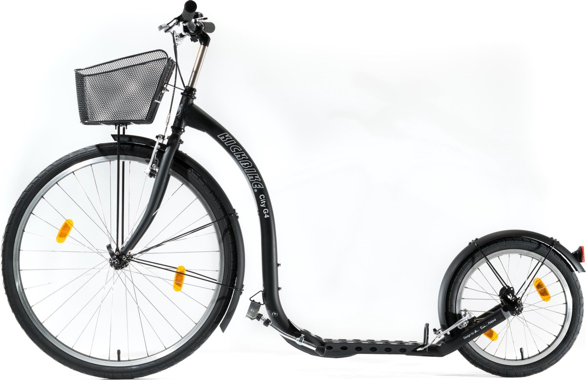 De Kickbike City G4 is een robuuste, luxe step ontworpen voor kinderen vanaf ongeveer 7 jaar maar met een draagvermogen dat ook volwassenen kan dragen. Hij combineert een groot voorwiel met een compacter achterwiel, waardoor hij goed over harde paden rolt en tegelijk geschikt blijft voor asfalt. Deze uitvoering is uitgevoerd in zwart en wordt geleverd met praktische accessoires zoals een mandje, bel en spatborden.