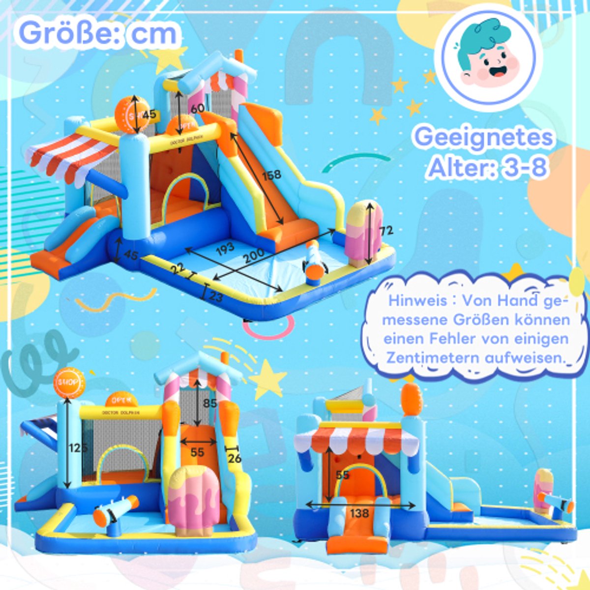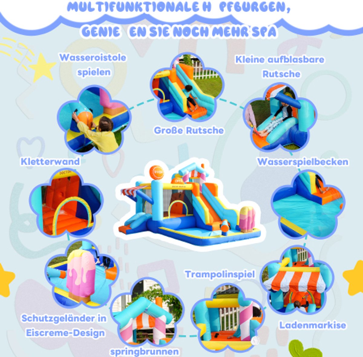 Dit opblaasbare speelparadijs is een groot, multifunctioneel springkussen dat is ontworpen voor kinderen van ongeveer 3 tot 8 jaar. Het combineert meerdere glijbanen, waterspeelzones, een klimwand, een trampolinevlak en speelse details zoals een winkelluifel en waterpistolen, zodat het zowel als waterpark in de zomer als droog springkussen in andere seizoenen gebruikt kan worden.