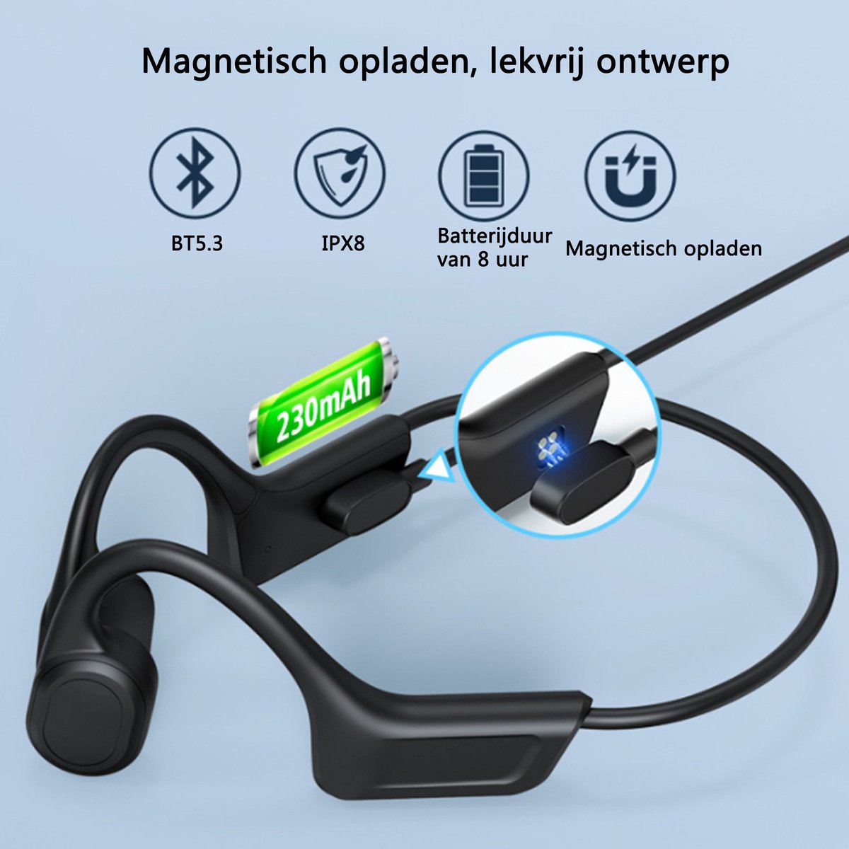 Voordeel: geluid wordt via trillingen door je kaakbot naar het binnenoor geleid, waardoor je oren vrij blijven van fysieke dopjes. Dit is praktisch wanneer je in open water zwemt of buiten traint en je verkeer of instructies wilt kunnen horen.