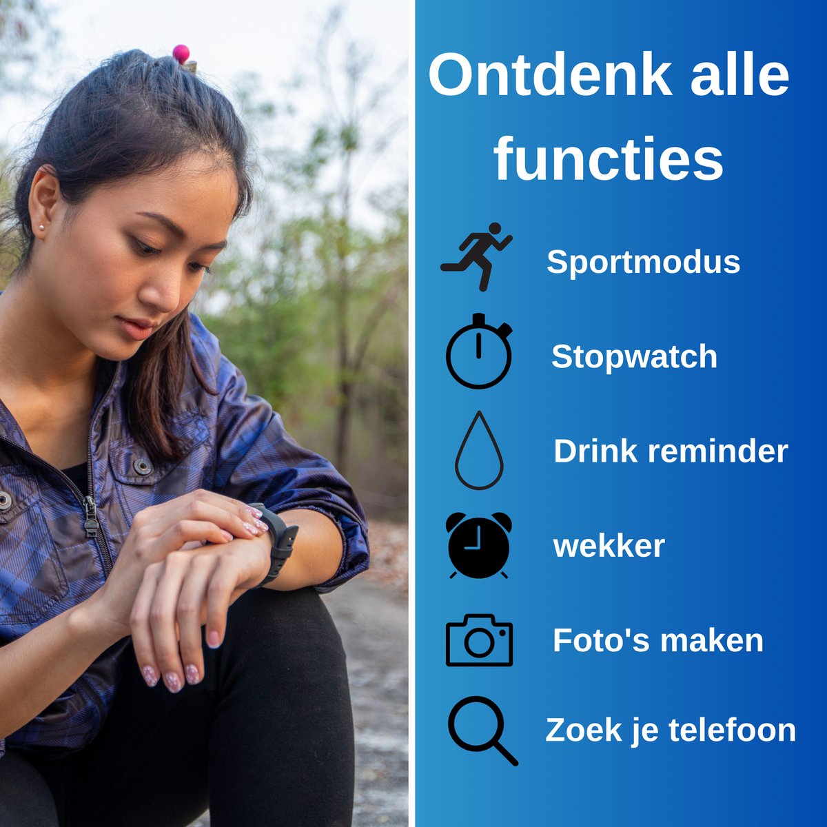 Ik heb geen smartwatch met allerlei toeters en bellen nodig, maar wilde wel een stappenteller en een horloge dat mijn telefoonmeldingen aangeeft. Hiervoor voldoet deze watch prima. Bij een oproep trilt hij vier keer zacht maar goed voelbaar, hetzelfde bij WhatsApp-berichten. Het is prettig om je stappen op het scherm te kunnen zien; dat motiveert om iets meer te bewegen. De bediening werkt redelijk: swipen gaat soepel, maar het selecteren vereist soms een precieze, langere druk op de juiste plek in het scherm. Gebruik hem niet voor slaapregistratie — die is onbetrouwbaar — maar dat deert mij niet heel erg, ik wil vooral de stappen en notificaties. De batterijduur is lekker lang. Eén klein irritatiepuntje: elke dag wisselt de wijzerplaat soms spontaan, die zet ik dan weer terug. Zou fijn zijn als er analoge wijzerplaten met echte wijzers bij kwamen, maar dat is persoonlijk. Al met al een prima apparaat voor die prijs; ik ben er tevreden mee.