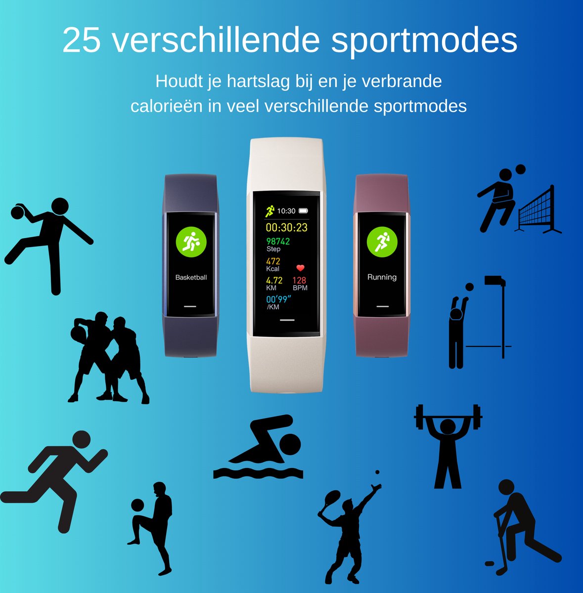 Waterdicht tot 8 meter — geschikt om mee te zwemmen (bron: productlisting, gecontroleerd 2025) | Polsgebaseerde bloeddruk- en SpO2-metingen zijn indicatief, geen vervanging voor medische apparatuur |