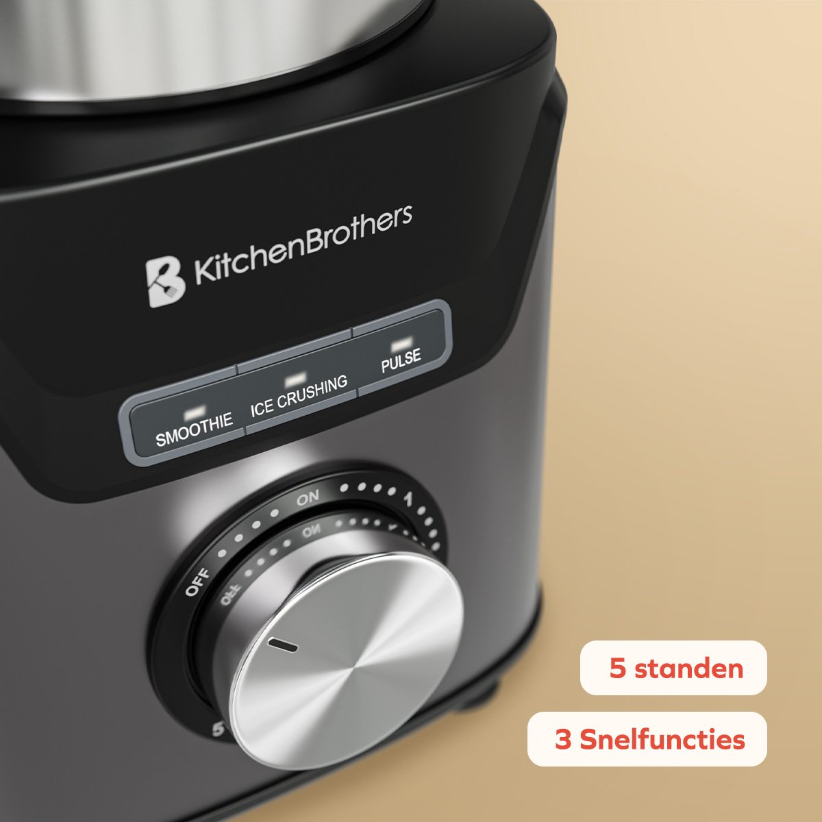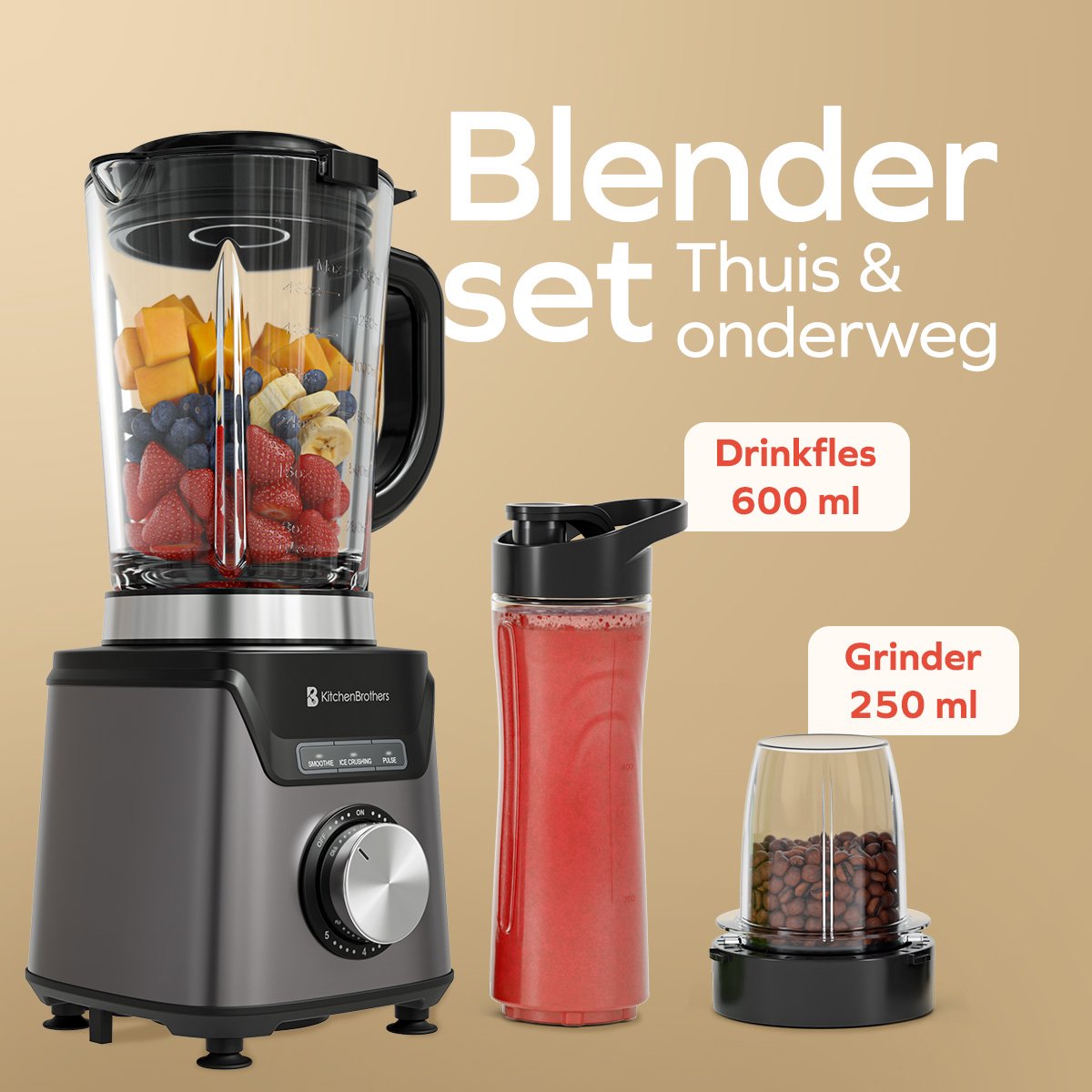 De KitchenBrothers Blender is een complete blender set voor dagelijks gebruik. Je krijgt een krachtige motor, een stevige glazen kan van 1,5 liter voor grotere porties, een to-go fles van 600 ml voor onderweg en een compacte grinder van 250 ml voor sauzen en kruiden. Daarmee vervang je in één klap meerdere apparaten, zonder je aanrecht vol te zetten.