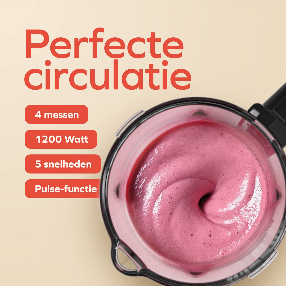- Geluid: geen geluidsniveau opgegeven. Verwacht bij 1200W een stevig geluid, vooral bij harde ingrediënten. Blend bij voorkeur op een snijplank of matje om resonantie te dempen.