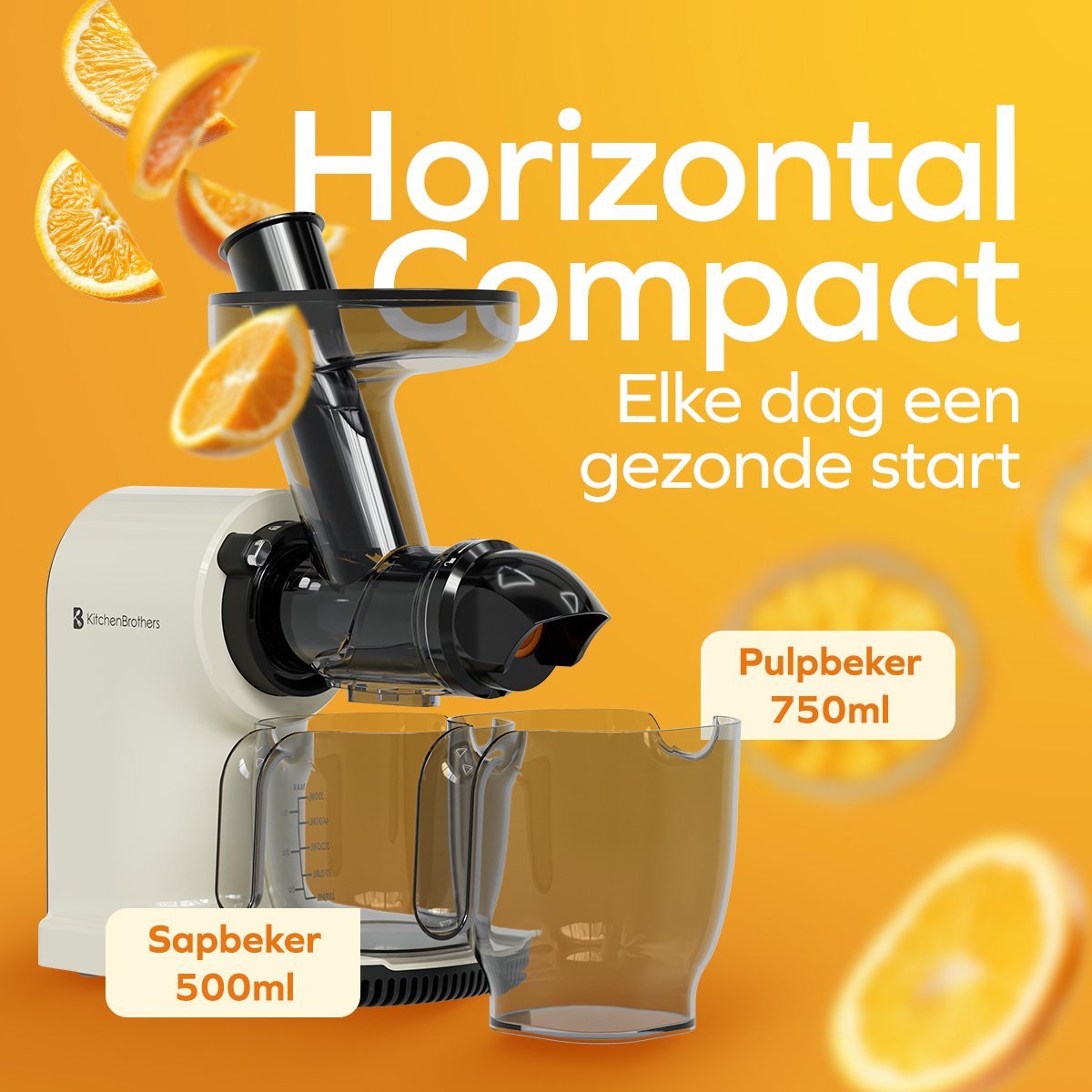 De KitchenBrothers Horizontal Compact Slow Juicer is een doordacht, compact apparaat voor iedereen die met minimale ruimte en inspanning toch vers, smaakvol sap wil persen. De langere persschroef zorgt voor een goede opbrengst, de bediening is simpel en dankzij de meegeleverde bekers en borstel kun je direct aan de slag. Als je kunt leven met voorsnijden en een gecontroleerd tempo, is dit een zeer praktische keuze voor dagelijks sap.