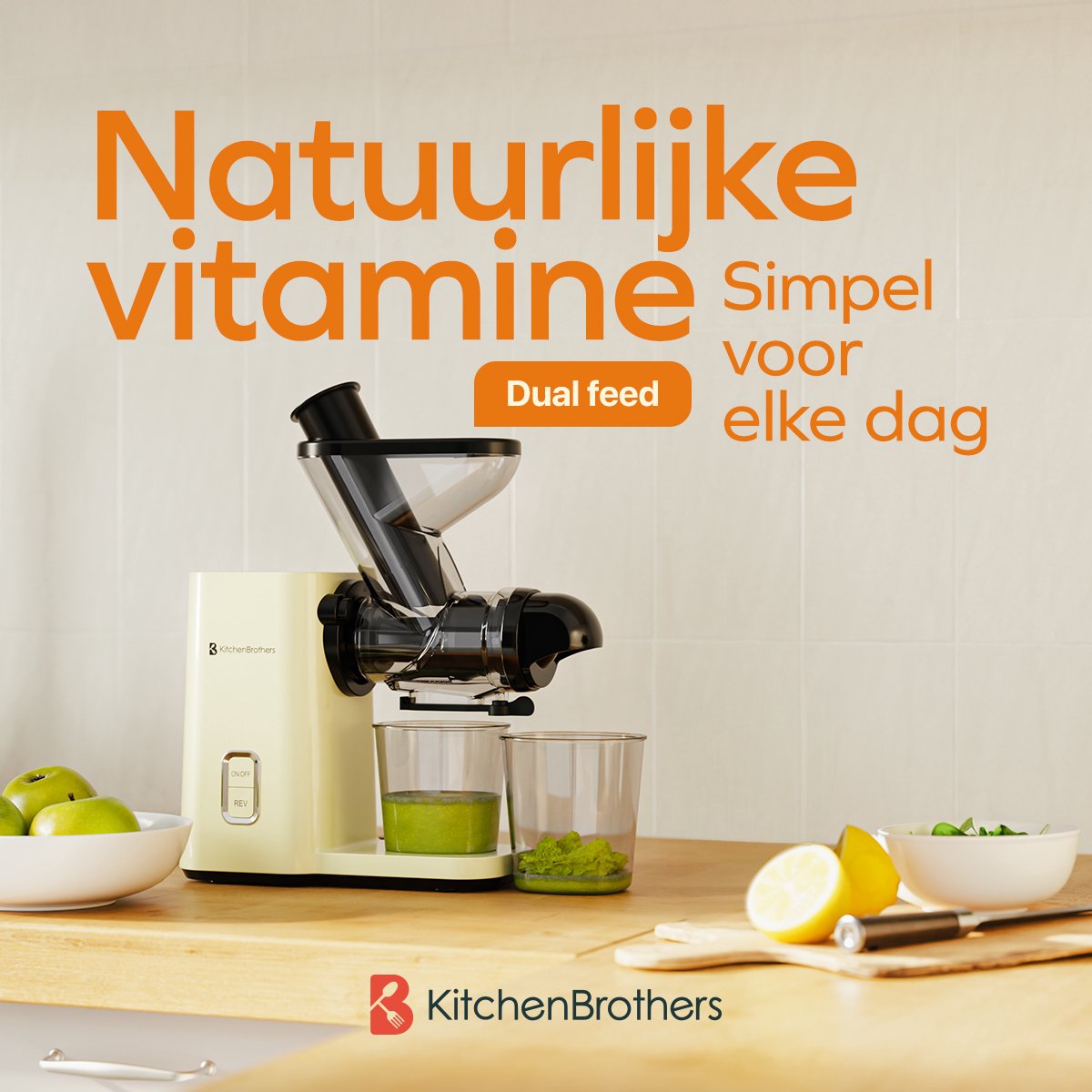 De KitchenBrothers Slowjuicer is een compacte slowjuicer die speciaal is ontworpen voor kleine keukens en drukke routines. Dankzij twee invoergaten (40 en 50 mm) en een langere persschroef perst hij groente en fruit langzaam en grondig voor een glas vers, voedzaam sap. De kern: maximale opbrengst, minimale ruimte.