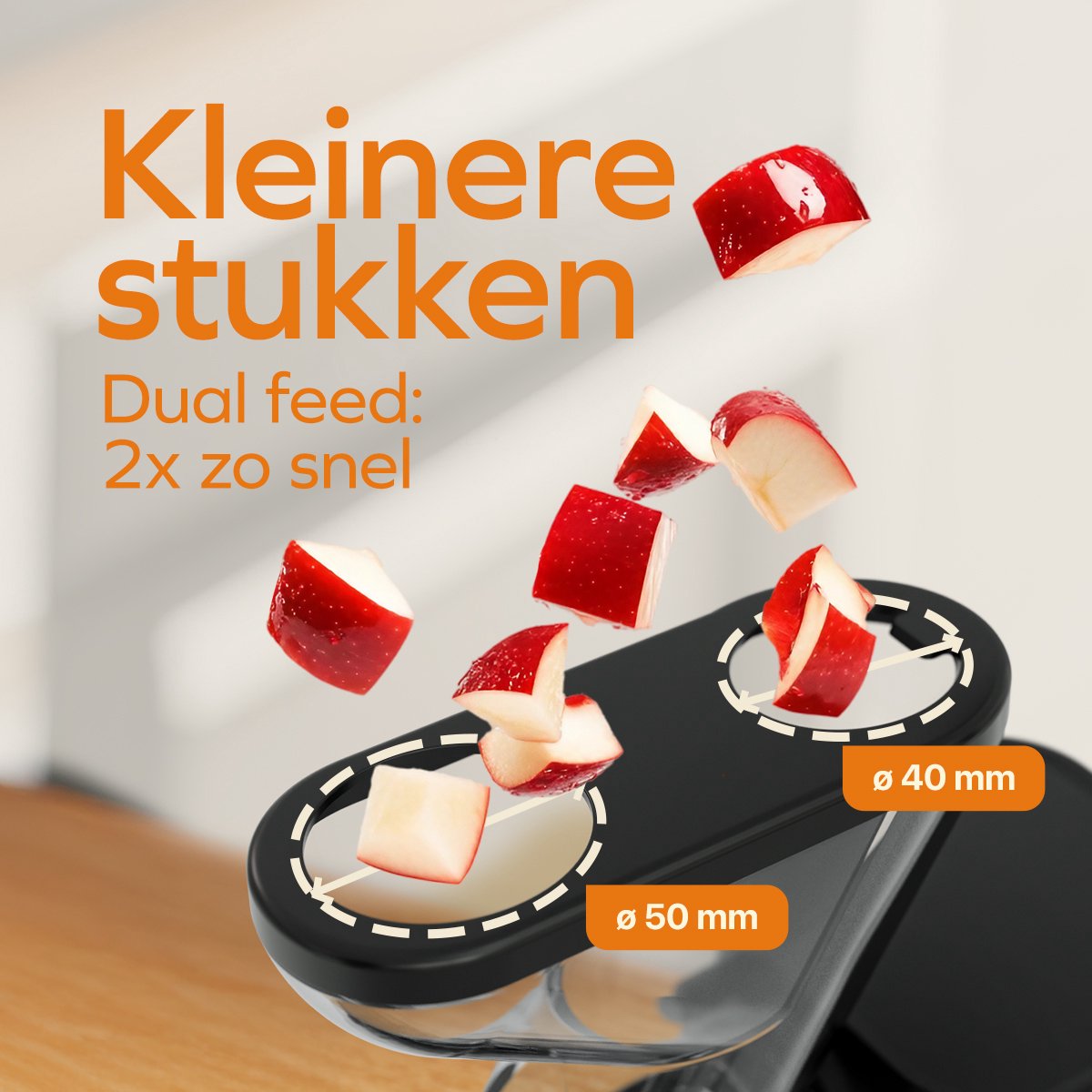 Twee invoeropeningen geven je flexibiliteit. De 40 mm opening is handig voor wortels, bleekselderij of reepjes bladgroen; de 50 mm opening pakt grotere stukken appel, sinaasappel of peer. Minder voorsnijden scheelt tijd en maakt dagelijks gebruik realistischer. Volgens de productinformatie werk je hierdoor sneller dan met een toestel met één invoeropening (bron: listing, gecheckt 2025).
