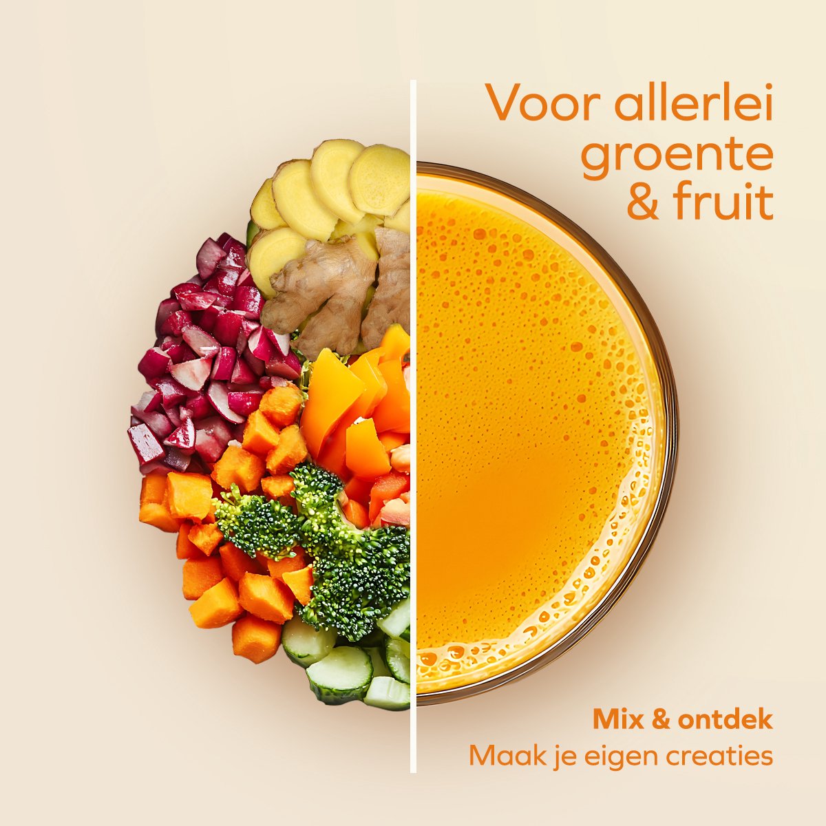 - Wortelboost: wortel + sinaasappel (geschild) + kurkuma. Gebruik de smallere opening voor wortelreepjes.