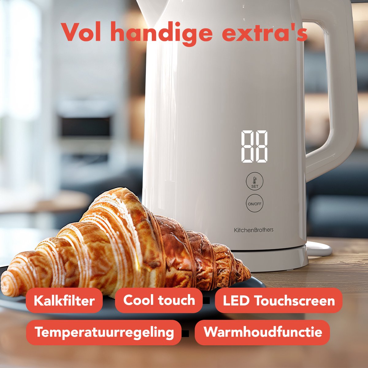 Zoek je een betrouwbare, ruime en precieze waterkoker die je dagelijkse dranken merkbaar beter maakt, dan is de KitchenBrothers waterkoker een zeer aantrekkelijke keuze. De combinatie van temperatuurregeling in stappen van 5 graden, een warmhoudfunctie, een led-aanraakscherm en een koelblijvende buitenkant is in de praktijk precies wat je wilt: controle over smaak, gemak bij meerdere koppen na elkaar en een veilig gevoel op het aanrecht. Het ingebouwde kalkfilter is een mooi extraatje voor helder water en een frisse smaak.