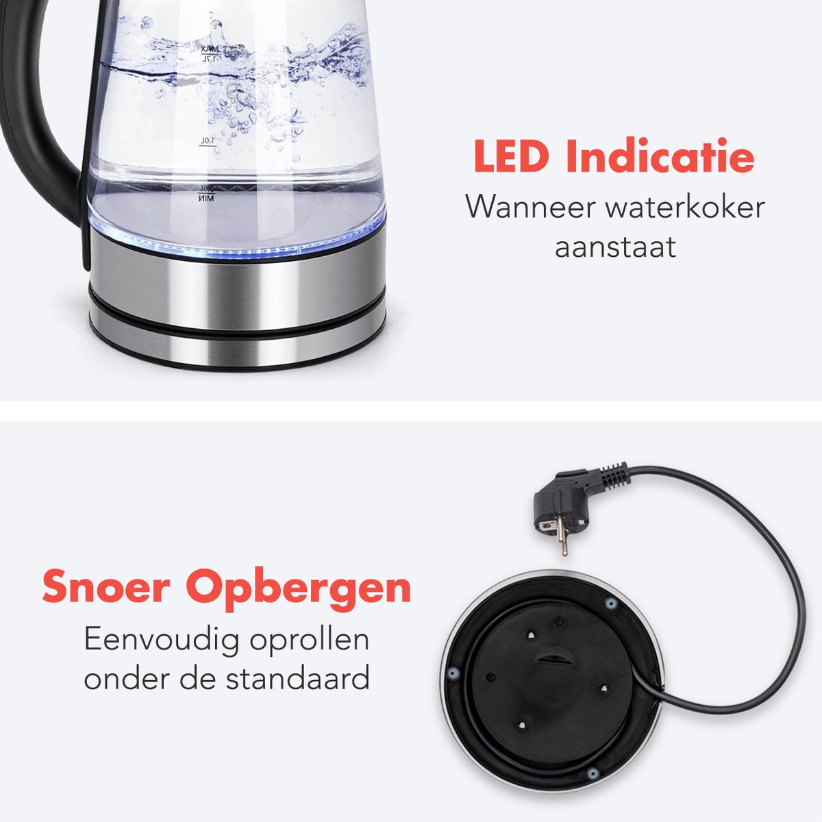 De blauwe led-indicatie licht op zodra de waterkoker aan het verwarmen is en dooft wanneer het koken klaar is. Dat levert een duidelijke statusweergave op, zonder dat je je hoeft af te vragen of het apparaat aanstaat. Zeker als je in de keuken meerdere taken tegelijk uitvoert, is dit een visuele reminder die tijd en aandacht vrijmaakt. Bovendien geeft het glas met verlichting een moderne, strakke uitstraling aan je keukenblad.