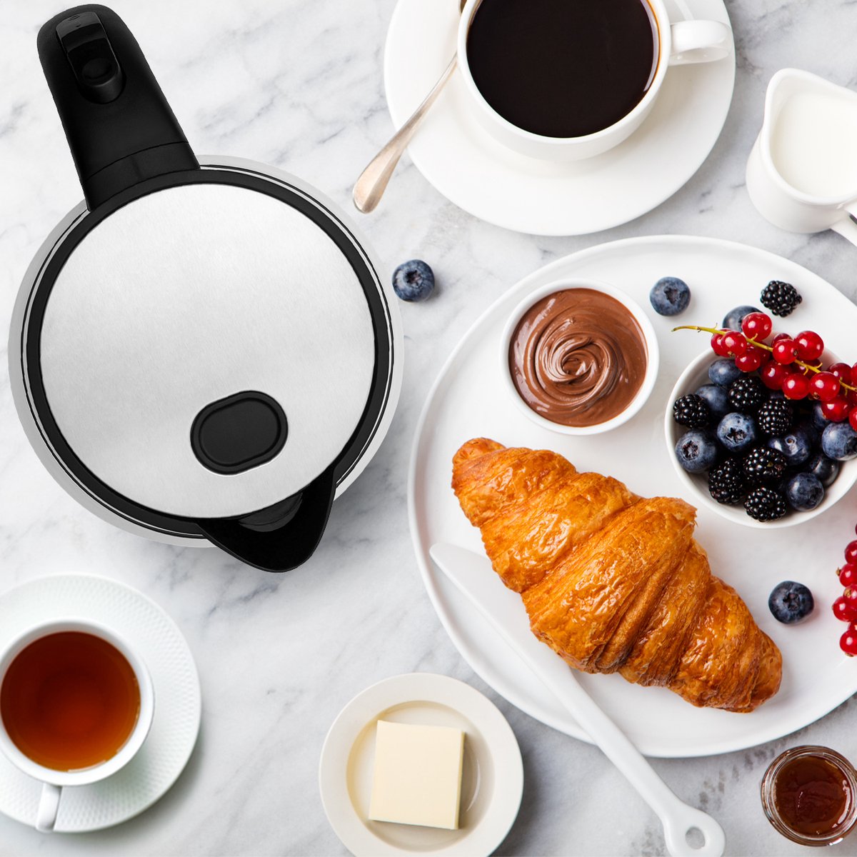 De 360° draaibare basis geeft je vrijheid: plaats de kan in elke richting terug en til hem zonder wrikken van de voet. In keukens waar meerdere mensen de waterkoker gebruiken, is dit meer dan een detail. Links- en rechtshandigen ervaren hetzelfde gemak, en ook op smalle aanrechten kun je de waterkoker in de meest logische hoek zetten. Het helpt slijtage aan het aansluitsysteem te beperken en versnelt je handelingen tijdens drukke momenten.