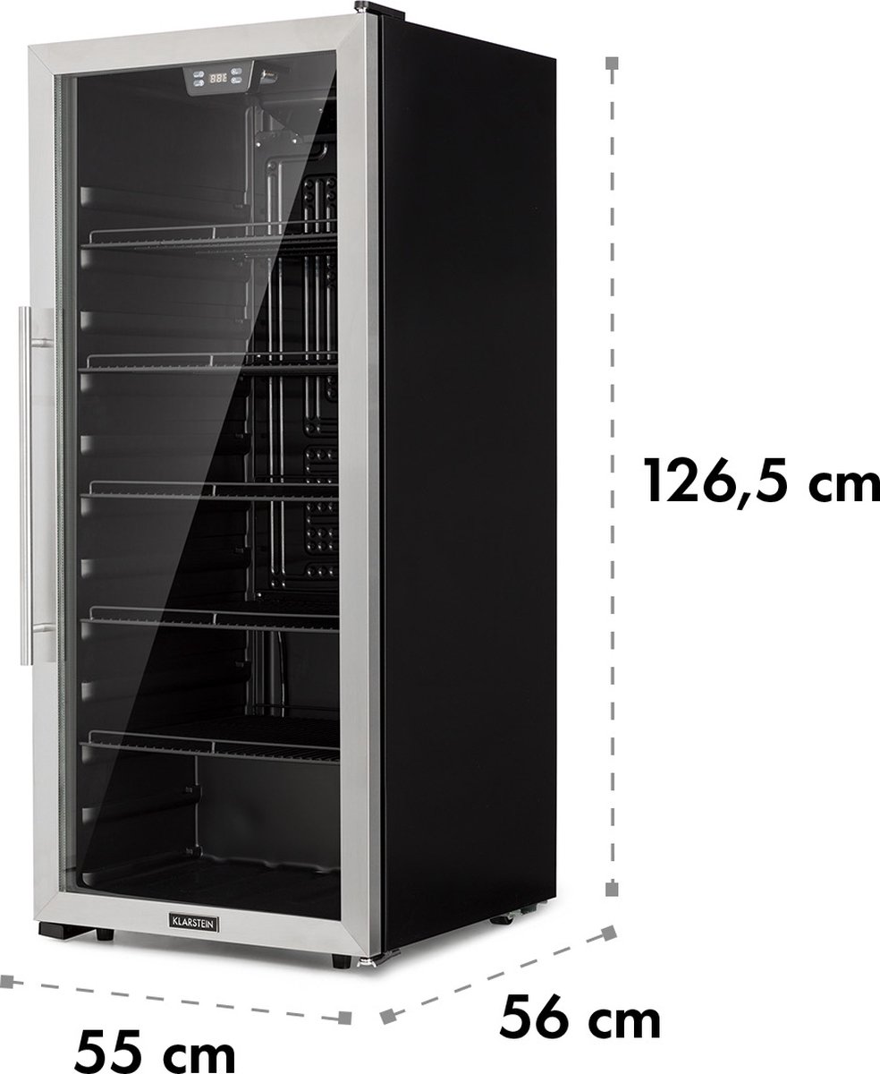 De Klarstein Beersafe 7XL is een grote, vrijstaande drankkoelkast met glazen deur en een royale inhoud van 242 liter (bron: listing, gecheckt 2025). Met vijf metalen legroosters, led-binnenverlichting en een strakke roestvrijstalen frontlijst is dit een stijlvolle oplossing om drankjes overzichtelijk en op serveertemperatuur te bewaren.