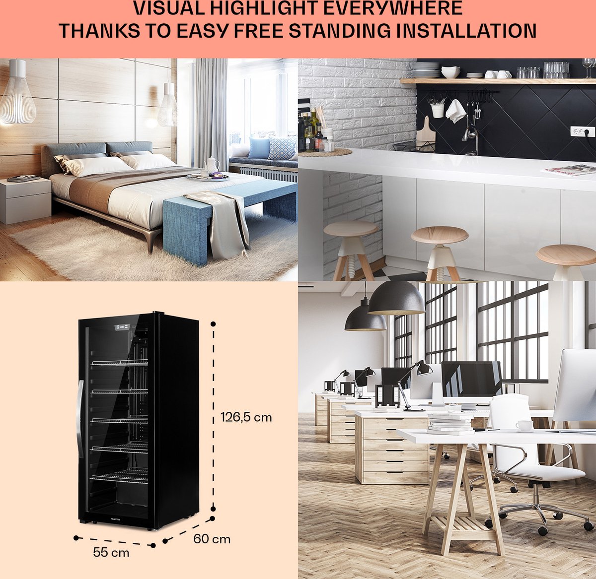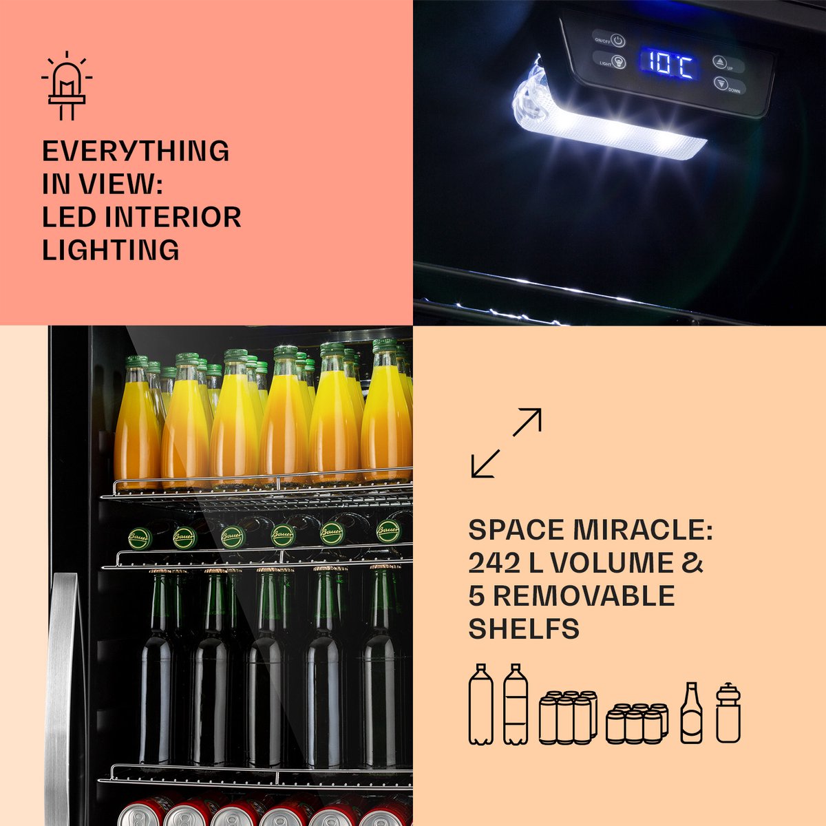 H3 Zwarte binnenkant met led-binnenverlichting: alles in één oogopslagDe zwarte binnenkant vormt een mooi contrast en laat de led-binnenverlichting extra goed tot zijn recht komen. Visueel presenteert dat je dranken aantrekkelijker, zeker in de schemer of bij sfeerverlichting. Praktisch voordeel: je ziet direct welke rij bijna op is, waardoor je sneller en gerichter bijvult (bron: productlisting, gecontroleerd 2025).