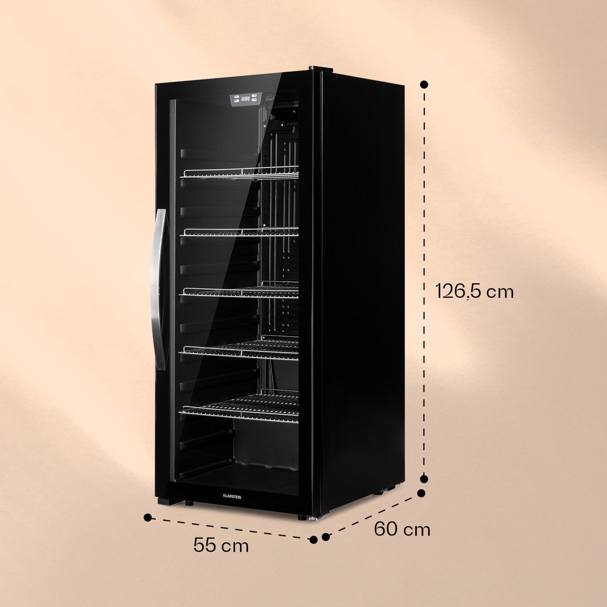 Zoek je een royale drankenkoelkast die er net zo goed uitziet als hij koelt? De Klarstein Beersafe 7XL is een staande drankkoelkast met 242 liter inhoud, vijf metalen roosters en een dubbel geïsoleerde glazen panoramadeur. Hij is ontworpen om veel flessen en blikjes overzichtelijk en op constante temperatuur te bewaren, met een chique voorkant van geborsteld roestvrij staal en sfeervolle led-binnenverlichting.