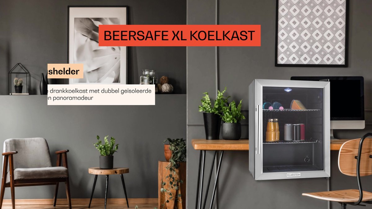 Overview:De Klarstein Beersafe XL is een compacte drankkoelkast voor Nederlandse huishoudens, kantoren en studentenkamers. Met 60 liter inhoud en een dubbel geïsoleerde panoramadeur blijven drankjes zichtbaar én koel. Het roestvrijstalen front en de led-binnenverlichting maken hem stijlvol en praktisch.