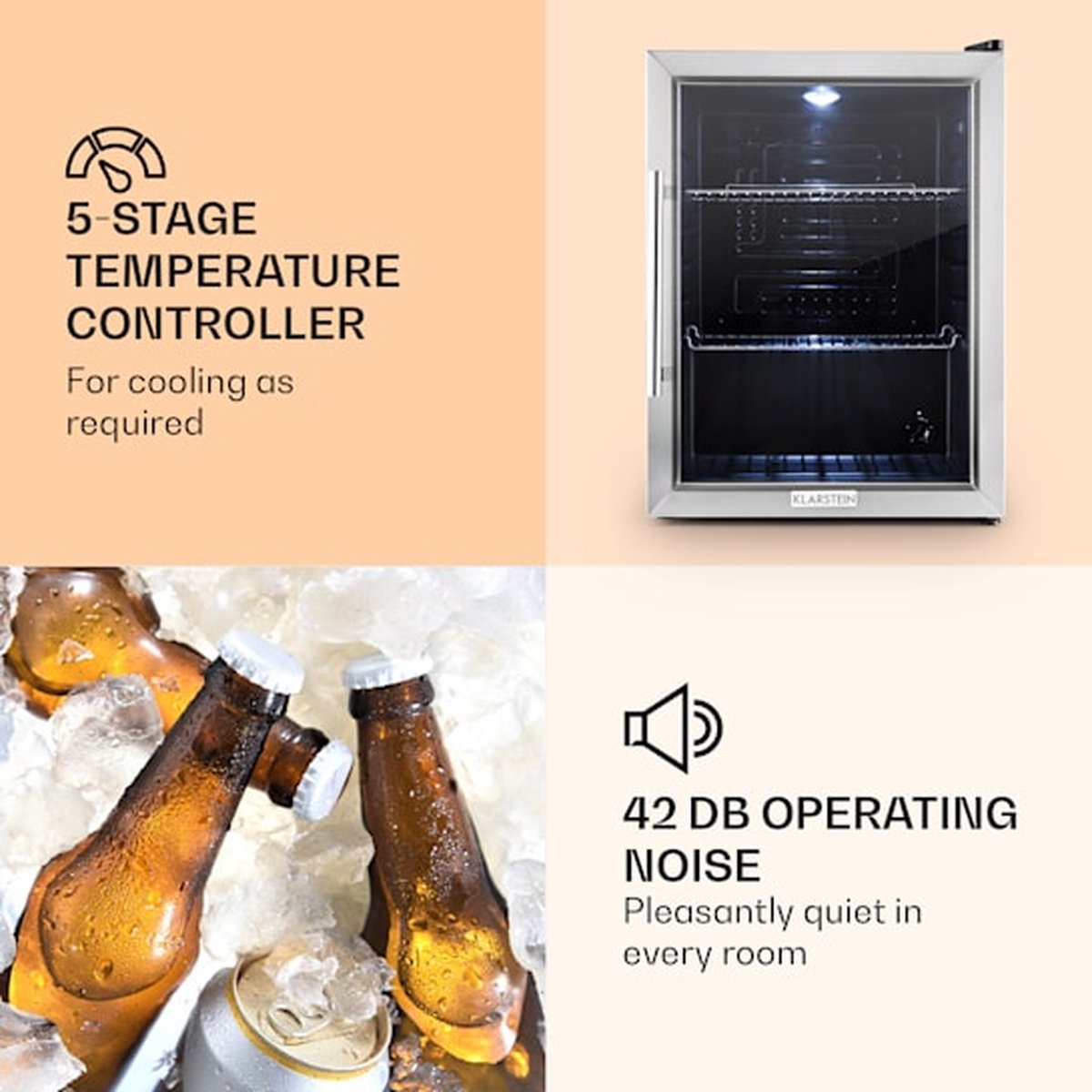 Aan de binnenzijde vind je een draaiknop met vijf standen. Daarmee regel je de koelte op gevoel en behoefte: een lagere stand voor bijvoorbeeld witte wijn of tonic, een hogere stand voor bieren die beter tot hun recht komen rond keldertemperatuur. Het systeem is eenvoudig en betrouwbaar in gebruik, zonder digitale poespas. Praktisch in de dagelijkse routine en snel aan te passen aan seizoenen of inhoud. Specifieke graden zijn niet opgegeven; zie de tips verderop om de beste stand te vinden voor jouw dranken.
