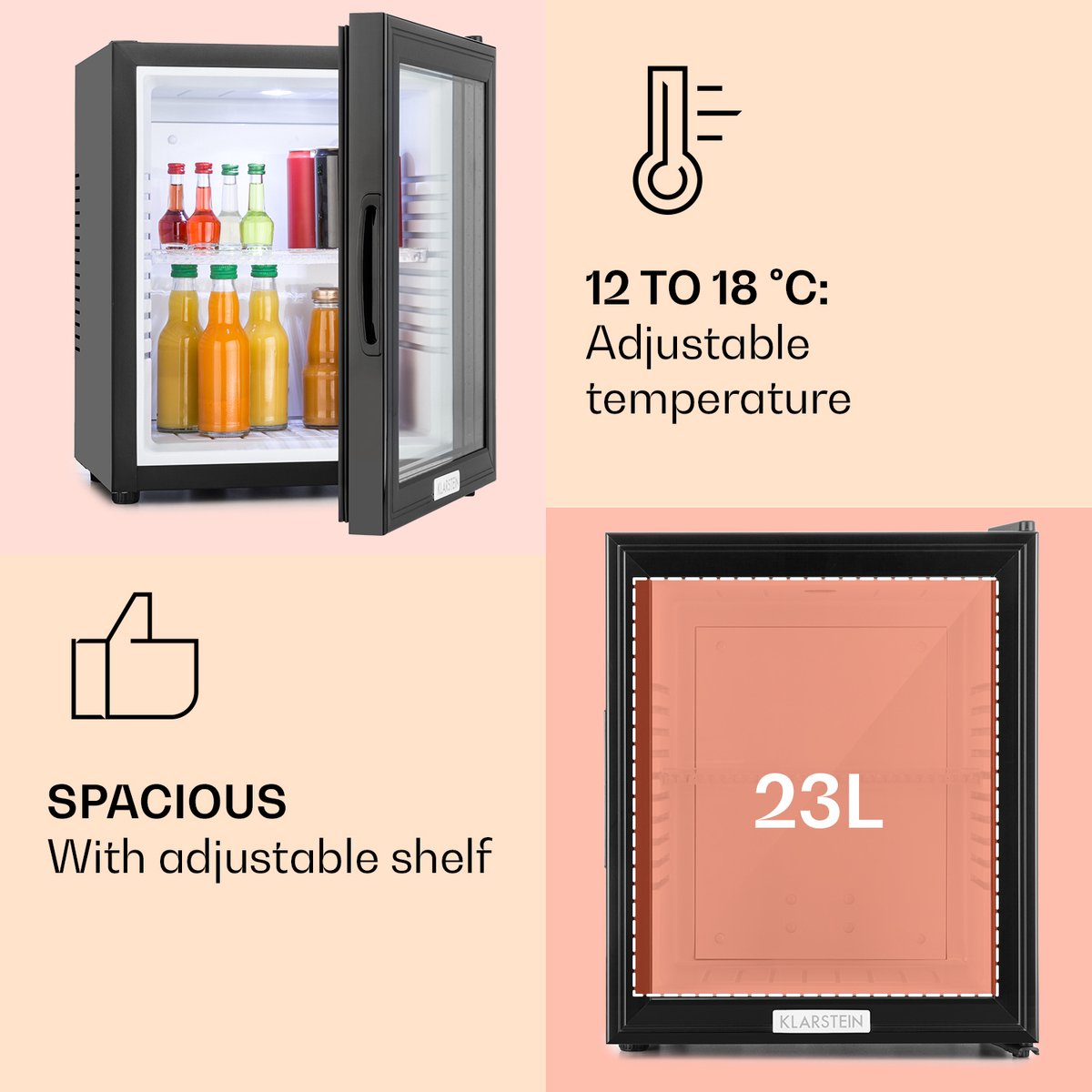 Overzicht:Dit is een fluisterstille minibar-koelkast met 24 liter inhoud, ideaal voor Nederlandse huishoudens en werkplekken waar rust telt. De Klarstein MKS-12 koelt drankjes en snacks zonder storend geluid (0 dB) en past dankzij zijn compacte formaat en glazen deur naadloos in kleine ruimtes.