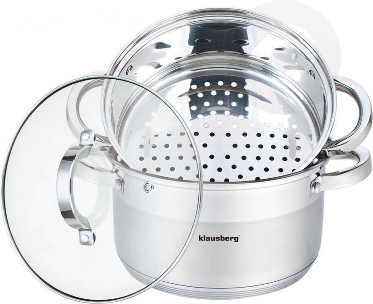 De Klausberg stoompan is een roestvrijstalen stoompan set met een meer-laagse bodem, ontworpen voor gelijkmatige warmteverdeling en efficiënt, gezond koken. Met een bodempan van 3,1 liter (Ø 20 x 10 cm) en geperforeerde pannen om te stomen, is dit een compacte oplossing voor iedereen die groenten, vis, aardappelen of dim sum gaar wil maken zonder extra vet. Volgens de vermelde specificaties is de set geschikt voor alle gangbare warmtebronnen, inclusief inductie.
