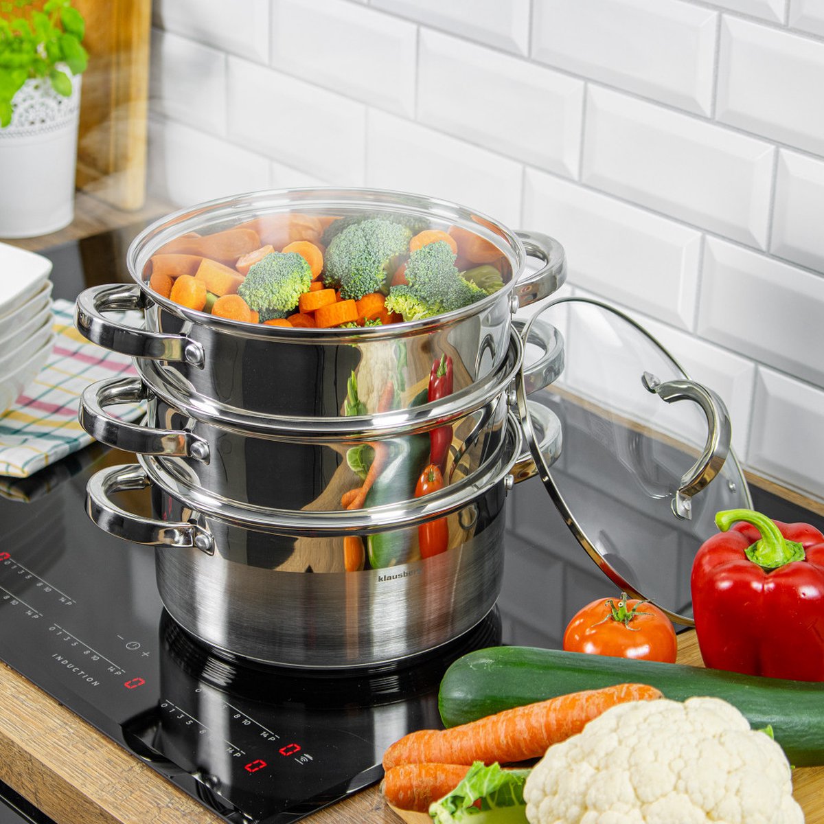 De Klausberg stoompan is een roestvrijstalen pan met geperforeerde inzetpannen om ingrediënten met stoom te garen. Dankzij de meerlaagse RVS-bodem (volgens de fabrikant/listing) warmt de pan gelijkmatig op en behoudt hij stabiel warmtecontact op elk type kookplaat, inclusief inductie. Dit is een praktische keuze voor wie graag groente, vis, aardappelen of dim sum licht, smaakvol en voedzaam wil bereiden.