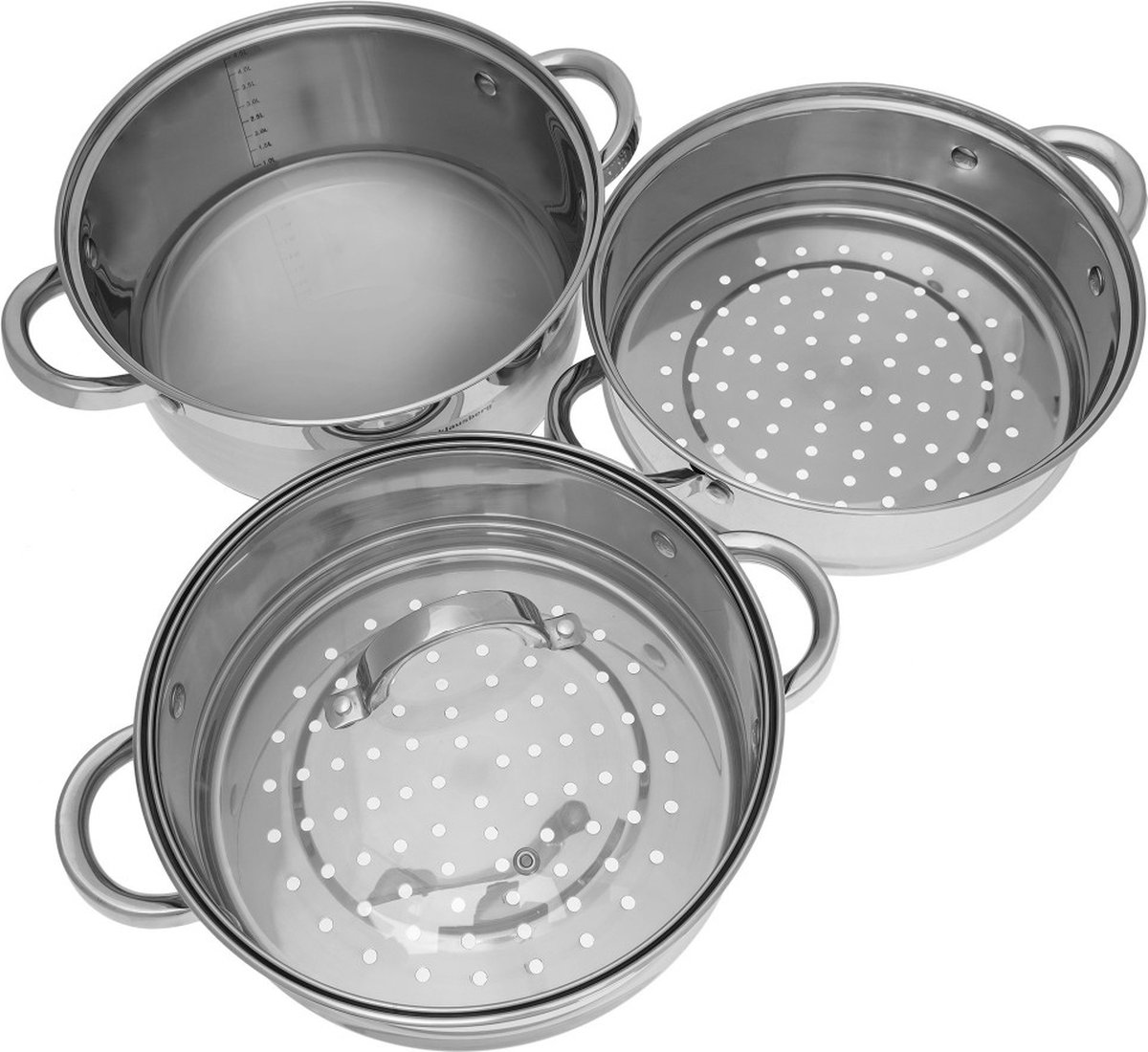 Volgens de fabrikant/listing heeft de onderpan een meerlaagse roestvrijstalen bodem. Dit type bodem heeft doorgaans een kern die warmte snel verspreidt en vasthoudt, waardoor je minder hotspots krijgt. Praktisch voordeel: je stoomt gelijkmatig, ook als de pan niet volledig vol ligt. Handig bij delicate producten als broccoli, wortel linten of zalmfilet, die je graag tegelijk gaar en sappig wilt hebben.