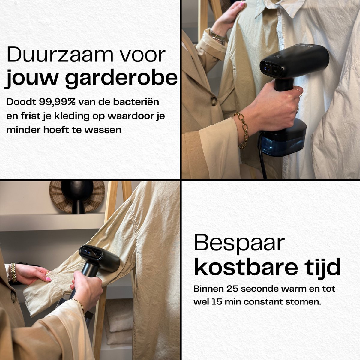 Volgens de productbeschrijving verwijdert de krachtige stoom nare geurtjes en tot 99% van bacteriën. Stoom kan inderdaad helpen bij het neutraliseren van alledaagse geuren in gedragen kleding en textiel, vooral bij frisse lucht en tijd om te drogen. Zie dit als een hygiënische opfrisbeurt tussen wasbeurten in.