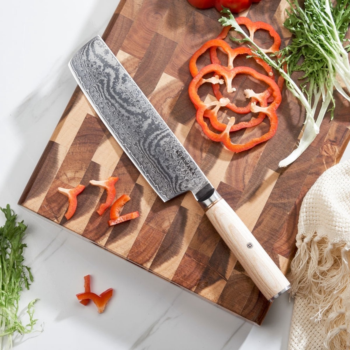 Dit is een verfijnd Nakiri mes dat inspiratie haalt uit traditioneel Japans snijwerk en is bedoeld om groenten snel, recht en gelijkmatig te verwerken. Het brede, rechte lemmet glijdt door tomaat, komkommer, kool of kruiden zonder wiebelen, terwijl het gelaagde staal zorgt voor langdurige scherpte. Zoek je een toegewijd groentemes met een luxe uitstraling, dan past dit model naadloos in een serieuze keukenuitrusting.