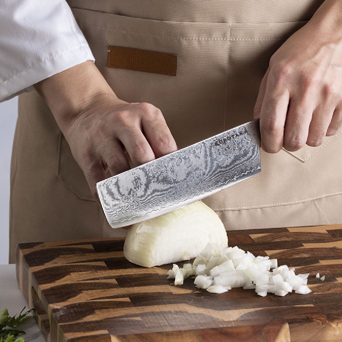 Het rechte profiel is het kenmerk van een Nakiri. Dit ontwerp snijdt in een zuiver op-en-neer beweging. Waar een koksmes vaak wiegt, houdt een Nakiri de snede vlak, zodat je blokjes en brunoise mooi recht en gelijkmatig worden. In de praktijk betekent dit: sprintend door uien zonder scheve sneden, flinterdunne plakjes komkommer of courgette zonder rafels, en perfecte reepjes kool voor salades en roerbak. Het brede lemmet ondersteunt groente en geeft je vingers een veilige geleider.